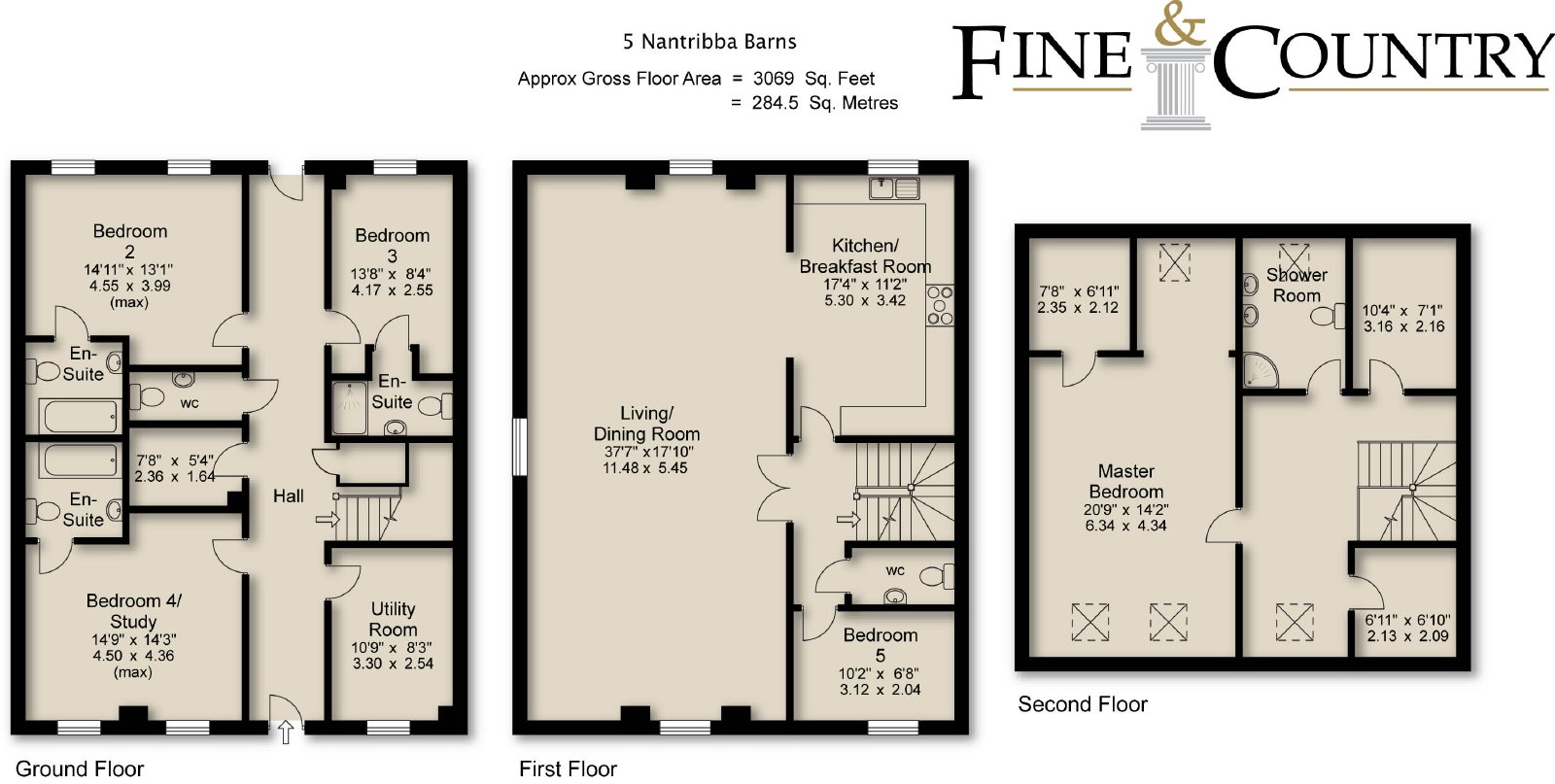 5 Nantcribba Barns is an exceptional Grade II listed converted barn, offering over 3,000 sq ft of spacious and elegant accommodation. The property has been thoughtfully designed to maximise its generous space, with a versatile layout spanning three floors. The ground floor features three bedrooms, all of which benefit from en-suite facilities, as well as a practical utility room. The first floor is home to a stunning open-plan kitchen, dining, and living area, while the second floor boasts a luxurious master suite complete with an en-suite bathroom and walk-in wardrobes. A seamless fusion of modern elegance and timeless charm, this deceptively spacious home boasts delightful character features such as exposed brickwork, lofty ceilings, and stunning oak beams.