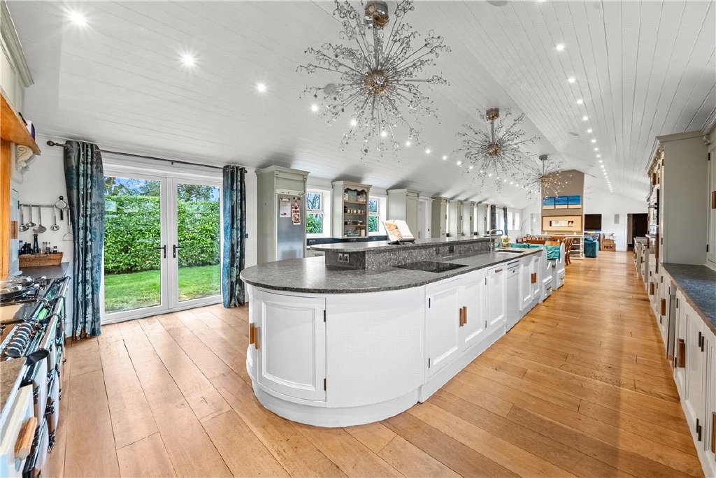 The farmhouse is anchored by a remarkable 68-foot kitchen, formed as three interconnected spaces and linked to the original house by a two-storey glazed structure completed in 2020. This central space connects to three substantial reception rooms, including a family sitting room, cinema/games room and walnut-panelled library. The upper floors provide six double bedrooms and contemporary bathrooms, including an exceptional principal suite with dressing area and circular marble wet room.