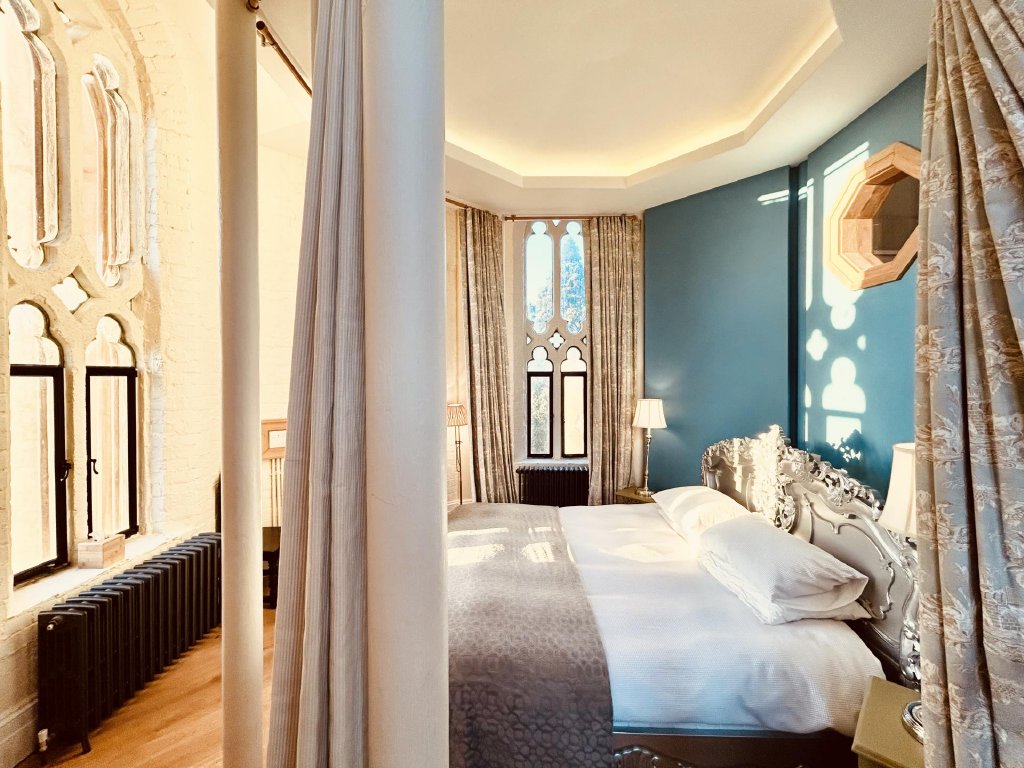 The octagonal drawing room on the next floor is something to behold with its gothic casement windows, polished wood flooring, exposed beams and amazing brick arched fireplace with a log burner but is also cosy enough for the family to enjoy relaxing and spending time together. There are steps down to a double bedroom that also has a charming stained glass window from the castle, lovely views over the grounds, an en suite bathroom and access to the secondary staircase.