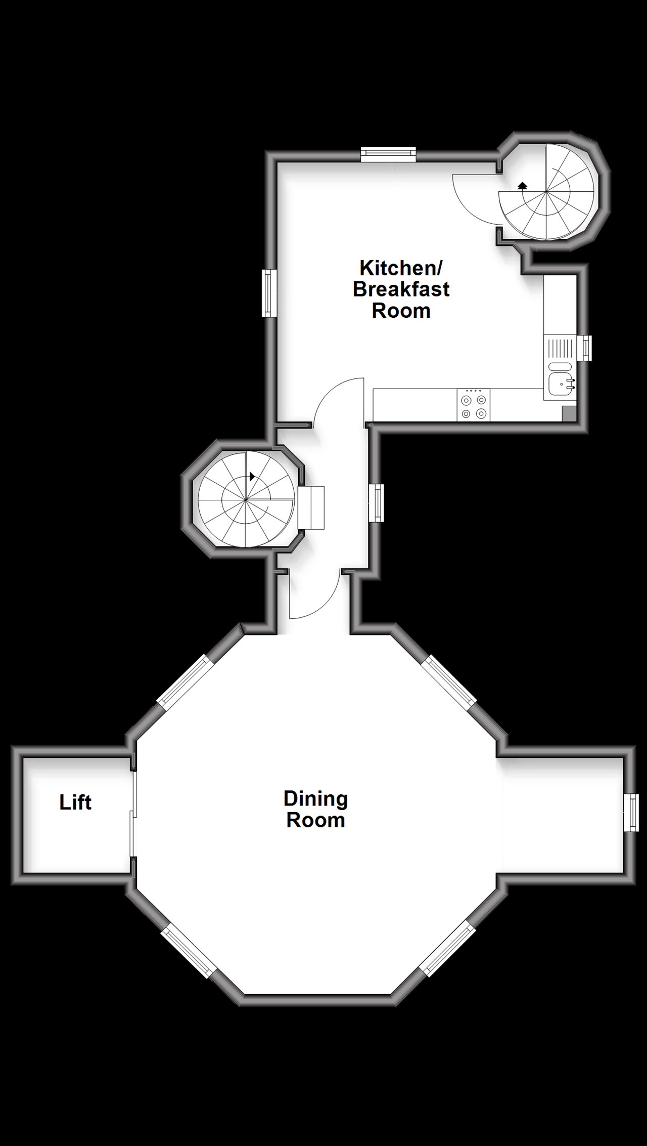 Opening the lift door on the first floor you are immediately confronted by a superb octagonal dining room where guests will be queueing up to be invited to a meal as this characterful room includes full height circle top arched windows providing far reaching views, a beautiful polished wood floor, a unique arched recess and sculptured oak doors that come from the original castle. These open into a small corridor with the main staircase and a second set of old oak doors that lead to the triple aspect kitchen/breakfast room with fantastic stained glass windows that were also rescued from the castle, access to the secondary staircase and shaker style units housing various appliances.