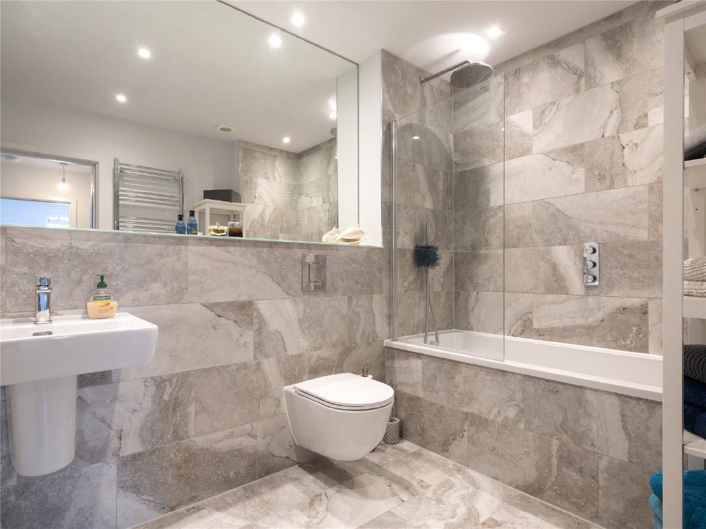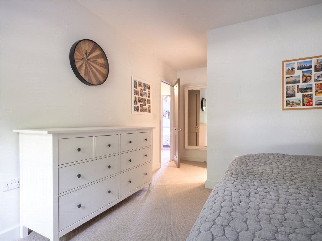 A spacious entrance hall leads through to the dual-aspect, open-plan living and dining area with white-washed oak finish laminate flooring underfoot, which comes with a 20-year warranty, and a traditional sash window to the front aspect with views over the private residents green. At the back of the house, the sleek, modern kitchen has been fitted with high-end, integrated appliances including a Bosch induction hob, oven and Zanussi dishwasher and fridge freezer alongside Silestone worksurfaces over. Completing the ground floor is the spacious guest cloakroom and a large utility cupboard. Underfloor heating has been fitted throughout the ground floor.