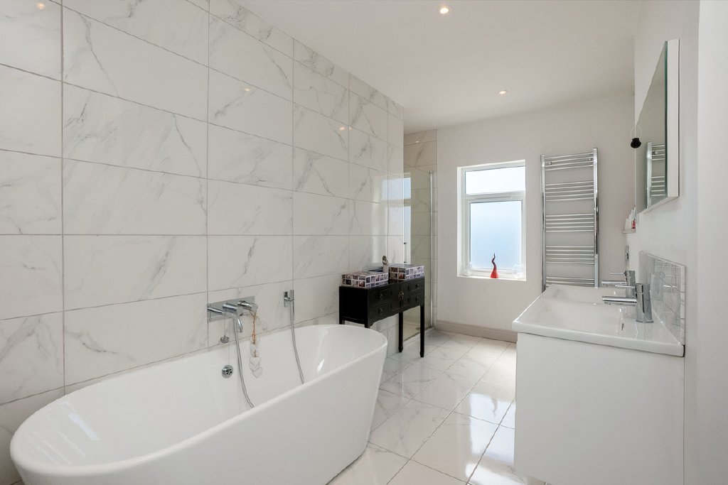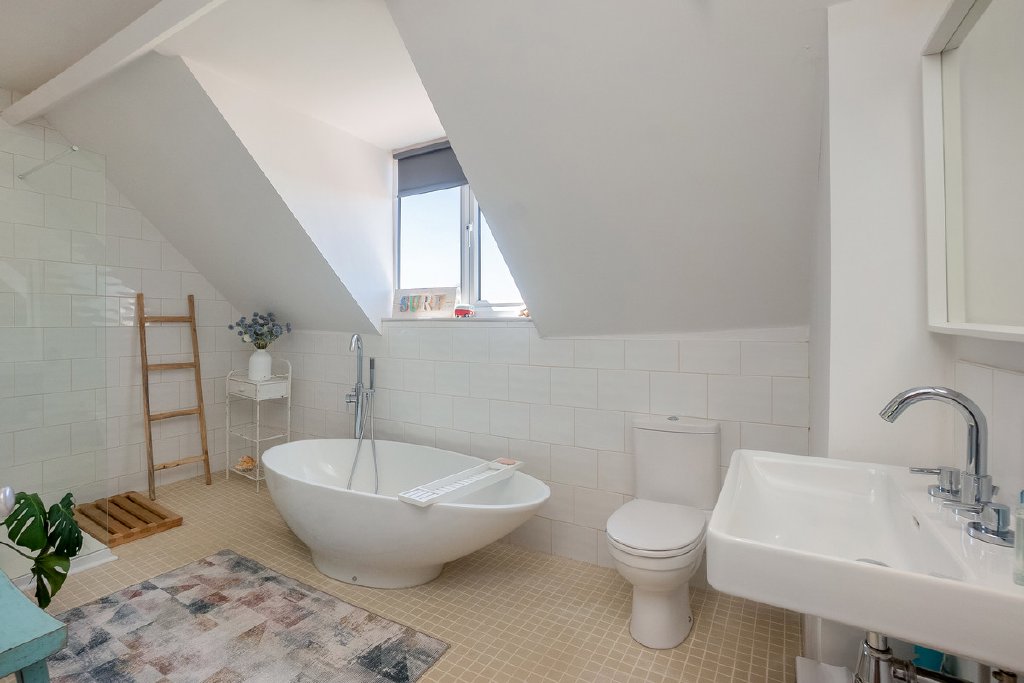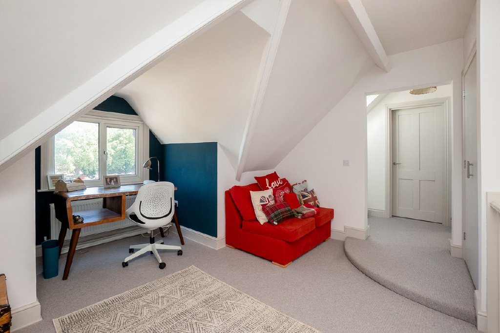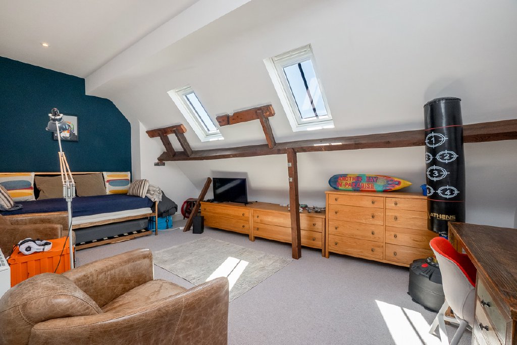 The good-sized double bedroom has exposed beams and is flooded with light from two skylights in the eaves. The single bedroom is currently used as an office space and again features exposed beams and a skylight window. The second family bathroom is a good size and features a freestanding bath and separate walk-in shower.