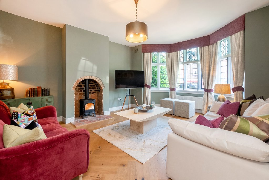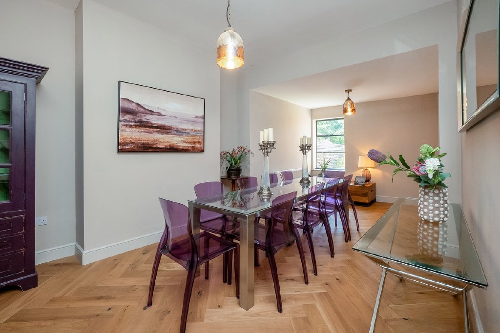 Upon entering the ground floor, the high-end finishes are immediately apparent in this stunning town house, with Oak herringbone flooring flowing seamlessly from the entrance hall into the three receptions rooms at the front of the house. The drawing room to the right of the entrance hall is a light and inviting space which is flooded with light from a large bay window and features a log burning stove with brick surround for those cooler nights.