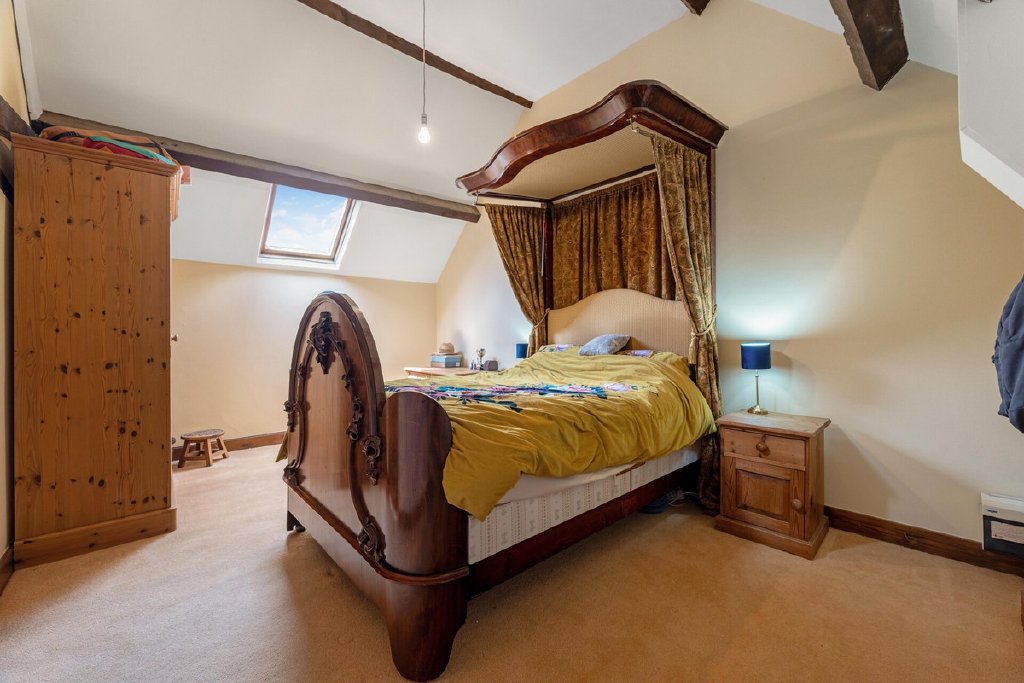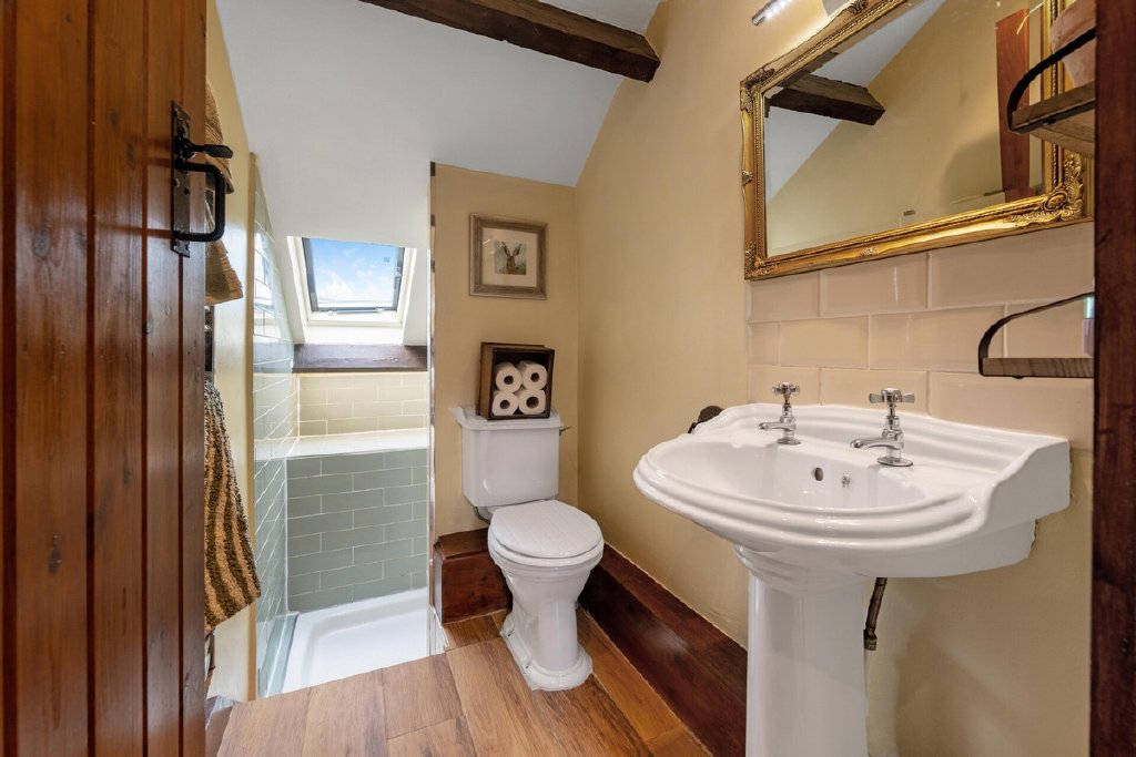 Upstairs offers four bedrooms, each with character features including exposed beams, sloped ceilings, and timber details. The principal bedroom is spacious and airy, while the additional bedrooms are perfect for family or guests. A generous landing with Velux windows provides extra seating space and natural light. There are two family bathrooms one featuring a bath, patterned floor tiles, and part-tiled walls, maintaining a charming barn-style feel throughout. A second bathroom is presented in a traditional style, featuring a white pedestal basin, WC, and a walk-in shower with classic green metro tiling. A Velux window provides excellent natural light, while exposed beams and wood-effect flooring complement the barn’s characterful charm.