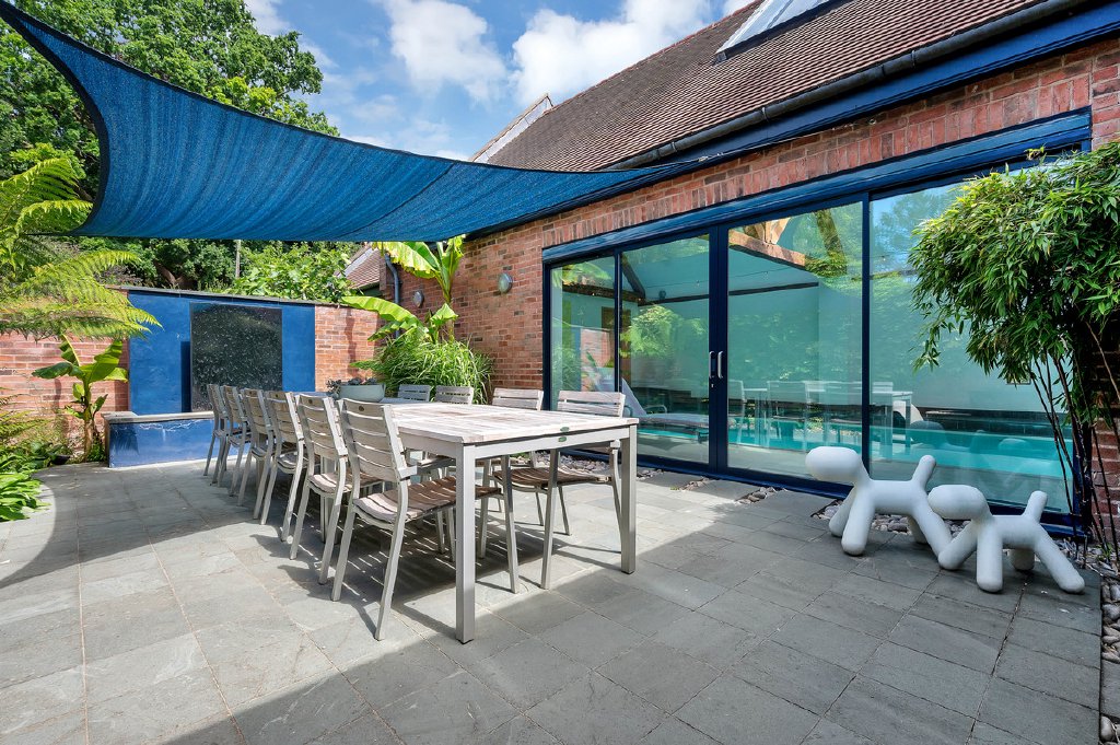 Without doubt, the heart of the home is the generous open-plan kitchen living space, thoughtfully arranged into defined cooking, dining, and sitting areas. Sleek contemporary units are centred around a stylish island, complemented by an AGA and a full range of integrated appliances. The kitchen space flows seamlessly into the dining and sitting zones, with French windows opening out to the garden. Just off this area is a garden room, currently used as a formal dining space.