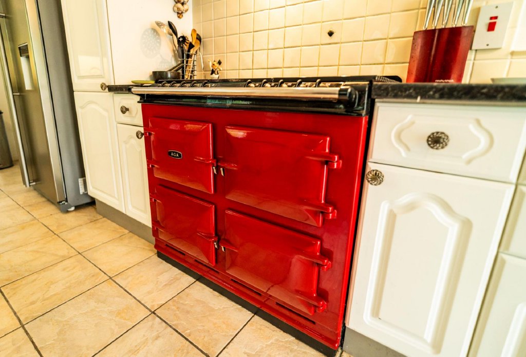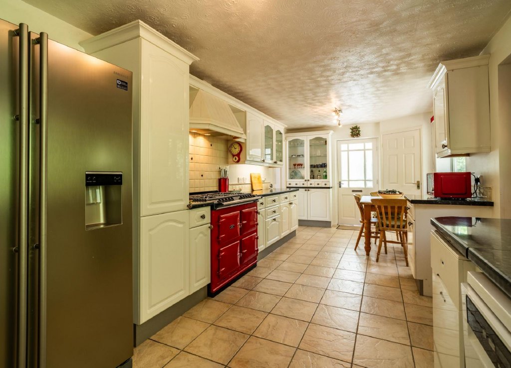 Inside, the home flows naturally across a series of well-proportioned spaces. The central sitting room is dual aspect and features a wood-burning stove and French doors opening onto the terrace, drawing the landscape inward. The kitchen–breakfast room is smartly fitted with white gloss cabinetry, an eye-catching pillbox-red AGA with gas burners, and a separate utility area. A newly refurbished conservatory with pitched glazing frames uninterrupted views across the valley beyond.
