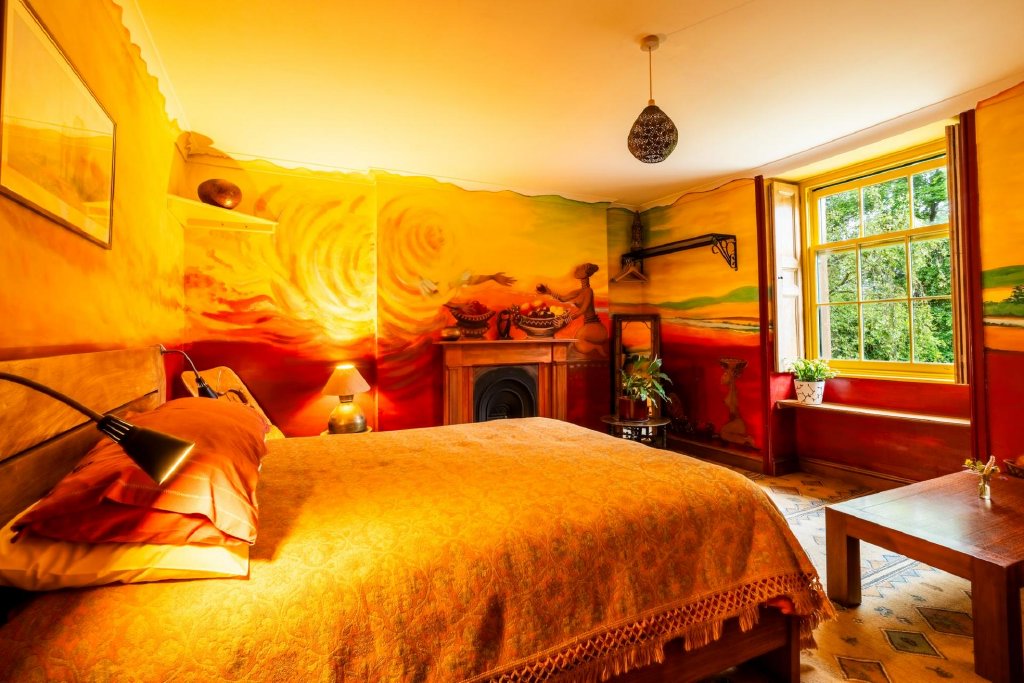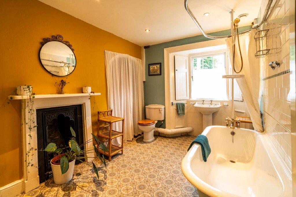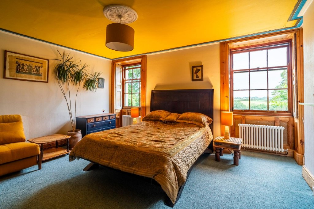 Upstairs, the first floor unfolds into an elegant collection of bedrooms. The principal suite is an exceptional space, with a round gable-end window, two additional sash windows, and enough room for a bed, sofas, and writing desk. Its en suite features a large rainfall shower. Two further south-facing double bedrooms feature decorative fireplaces and sash windows, one with a mural and the other with trompe l’oeil artwork.