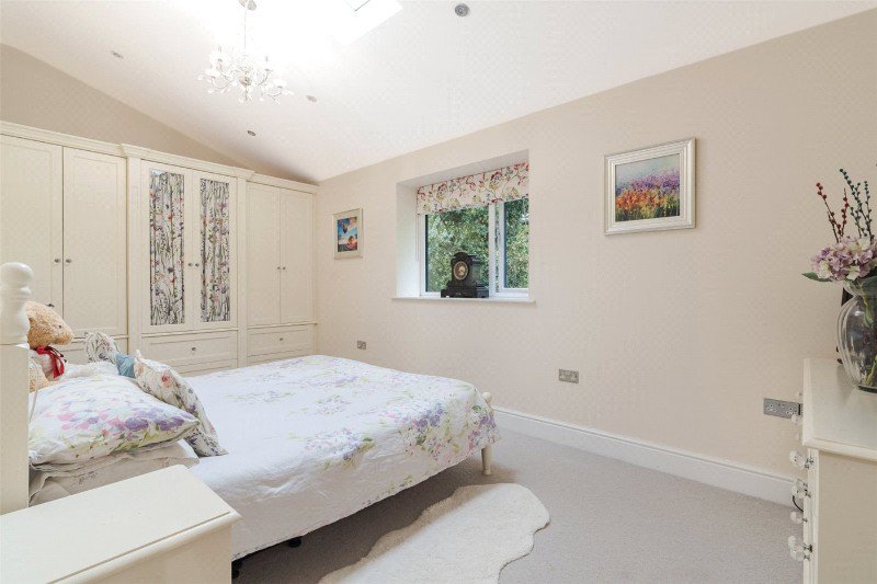 Bedroom 2 is a large double room with vaulted ceiling, Velux rooflight, and hand-painted floor-to-ceiling wardrobes with drawers beneath. Bedroom 3, a double room overlooking the gardens, with vaulted ceiling and Velux rooflight.