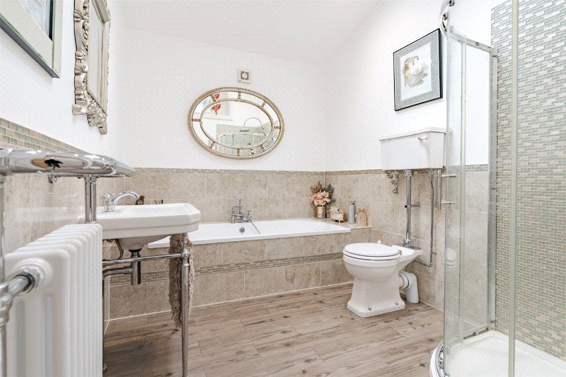 The family bath/shower room comprises double-ended bath, shower cubicle, wash basin on a chrome stand, high level WC, ceramic tiled floor and Velux rooflight.