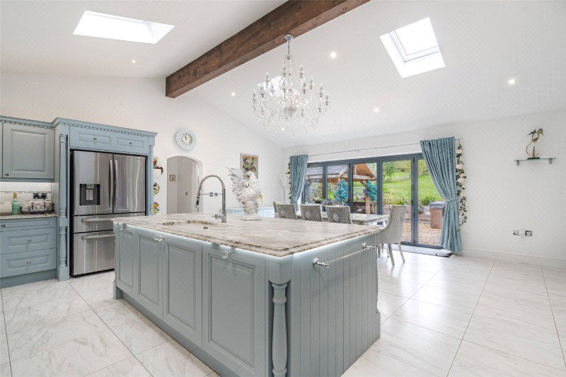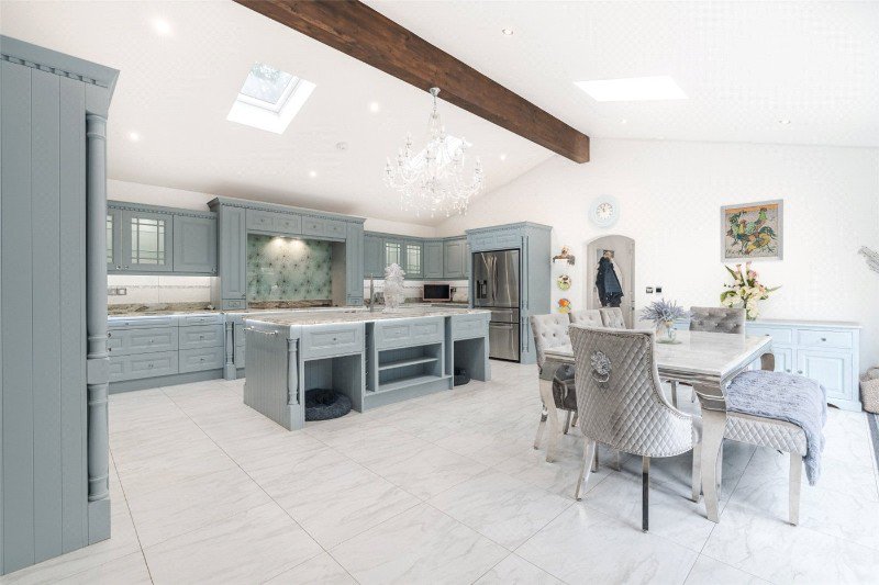 The magnificent kitchen/dining/family area features a high vaulted ceiling (with Velux rooflights), a porcelain tiled floor and brushed aluminium bifolding doors to outside. It has an excellent range of work surfaces and bespoke hand-painted units by Tony Smith Kitchens, an island unit and a 1.5 bowl scalloped-edge Blanco sink. Neff appliances include 2 convection ovens, 1 steam oven, microwave/grill, induction hob with wok burner and griddle, extractor and integrated dishwasher, and there is an integrated Samsung fridge-freezer.