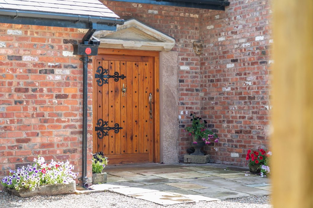 The snug and the sitting room share a double sided wood burning stove, on the snug side, the stone lintel above the stove is said to have come from Whalley Abbey as was some of the stone work used in the creation of the garden folly. Within the kitchen, the oak fronted Smallbone cabinets were sourced from Rehome, ensuring both style and sustainability. Another unique feature of the kitchen is the base of the island unit, look carefully and you’ll see it’s a double-sided partner’s desk, the space between the pedestals currently creating a quiet place for the owners’ dog’s bed! The original stables which stood on this site have also played a part in the new construction; pitch pine beams have been repurposed into window frames and the impressive front door.