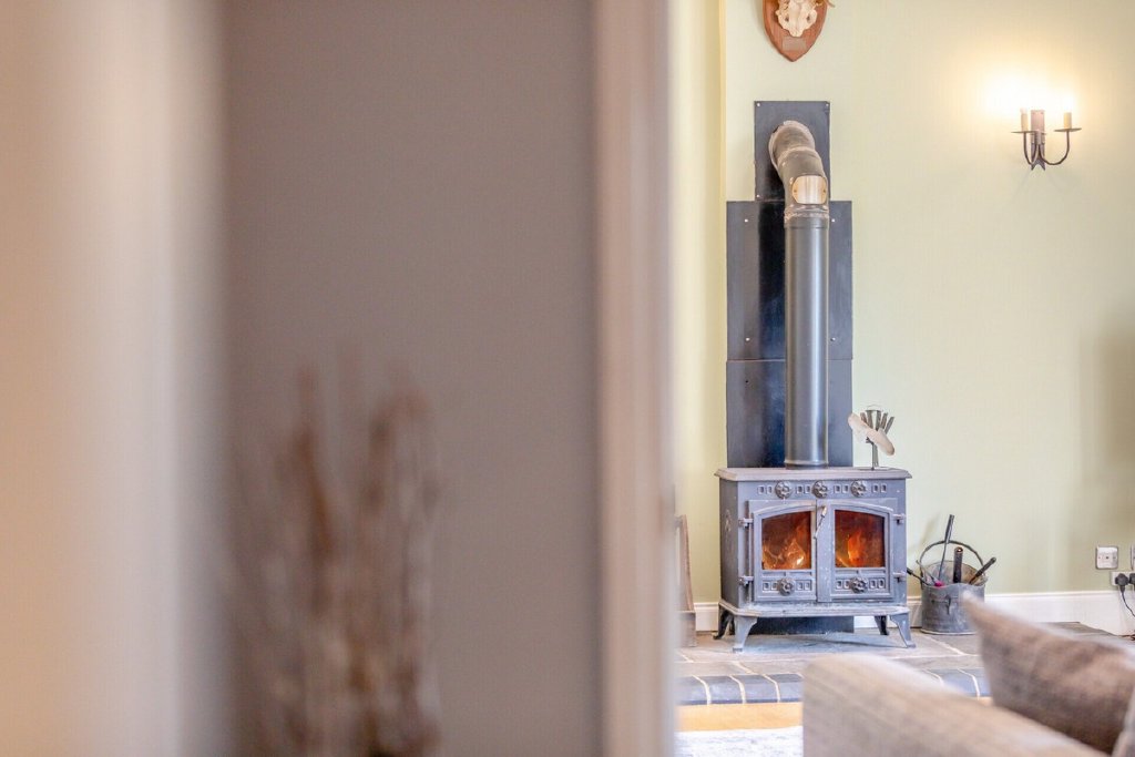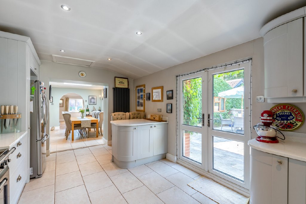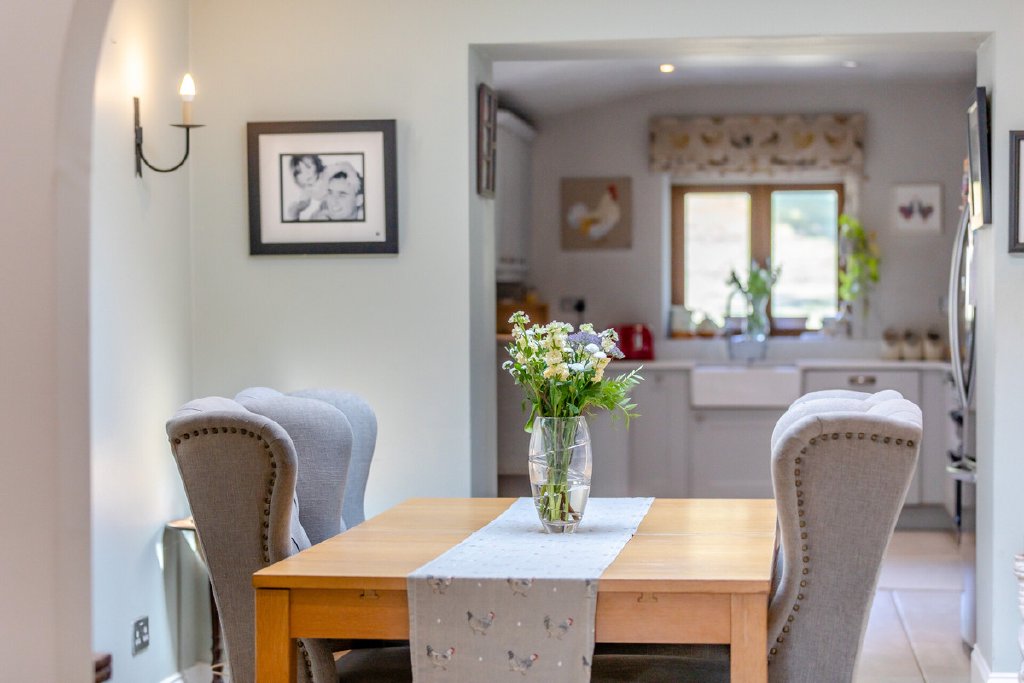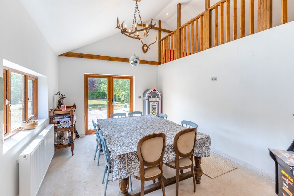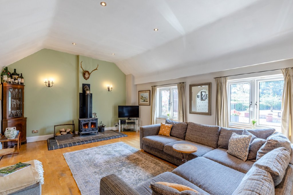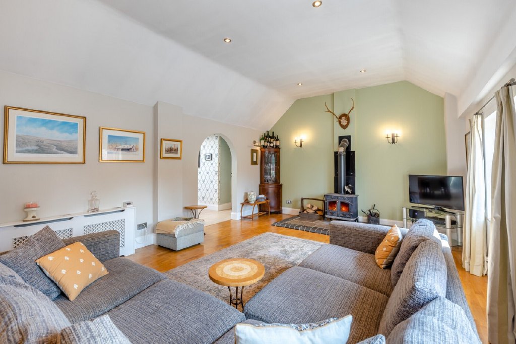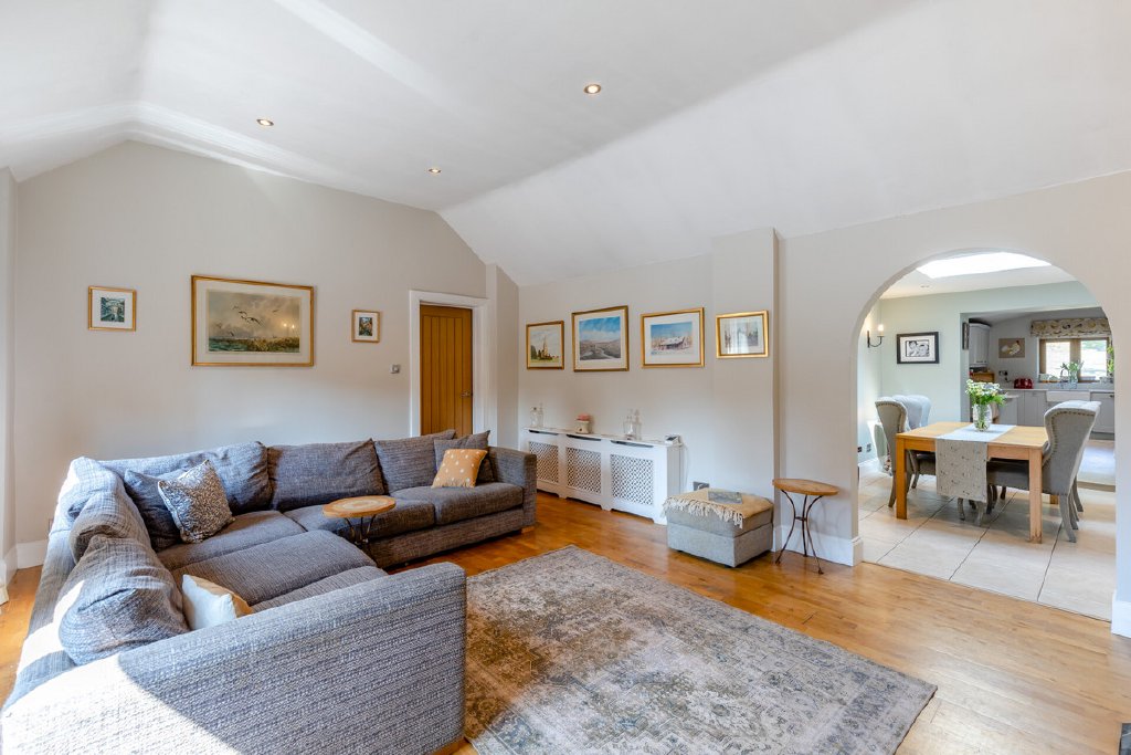 The main house has been thoughtfully designed to combine light-filled living with flexibility for modern family life. A generous sitting room with high vaulted ceilings, oak flooring and a wood-burning stove creates an impressive central space, flowing into an open-plan kitchen and dining area with direct garden access. Four bedrooms and two bathrooms are arranged with versatility in mind, including a principal suite with en suite, and a wing that can serve as a self-contained annexe if required.