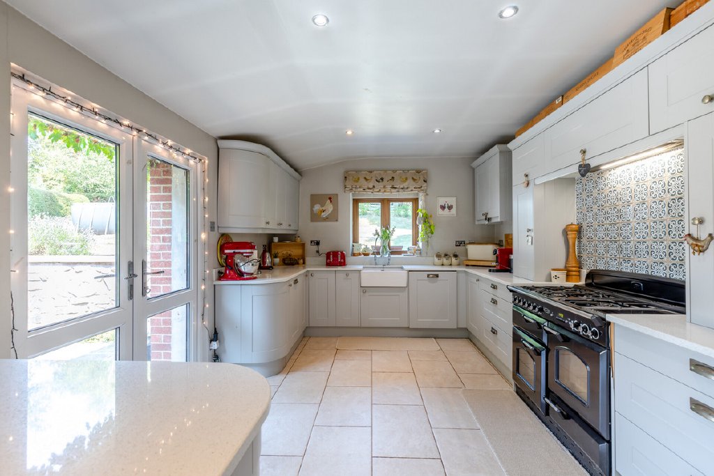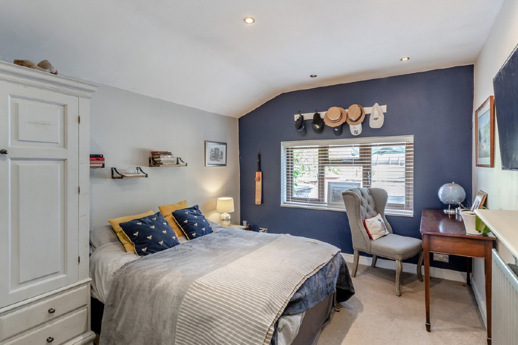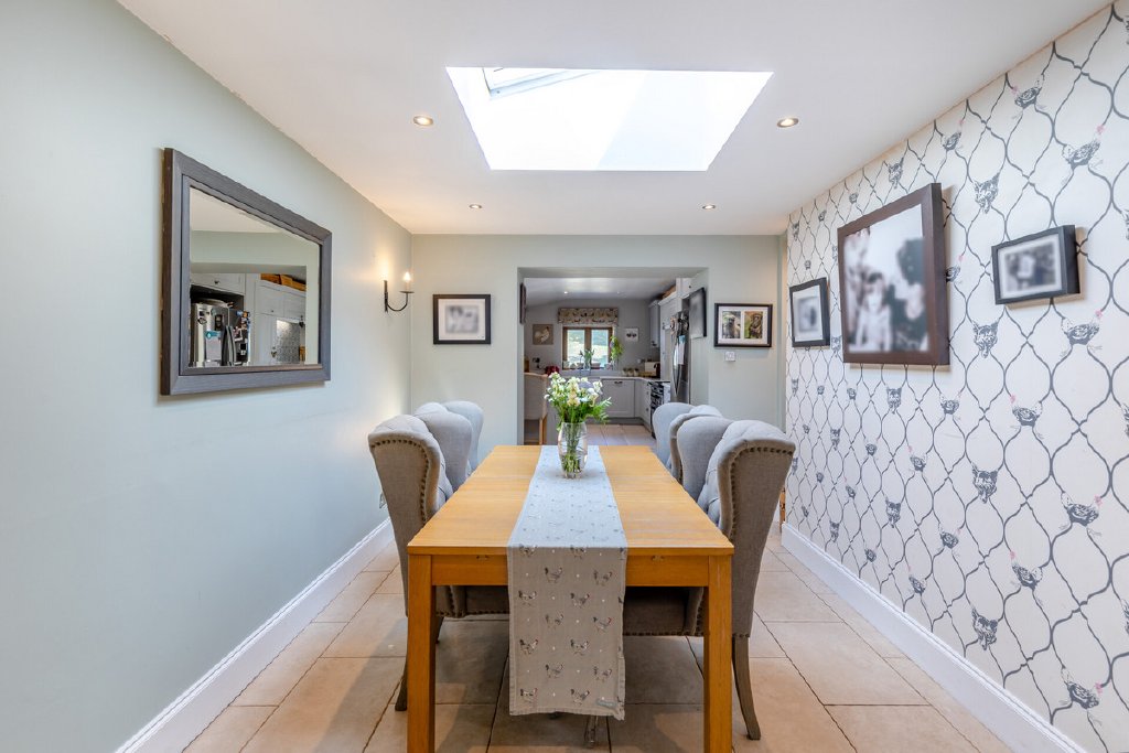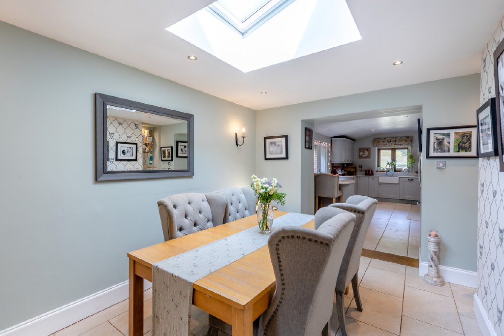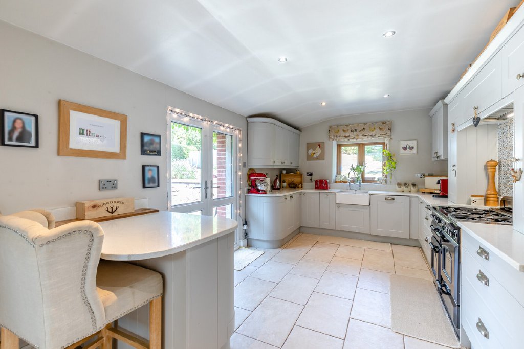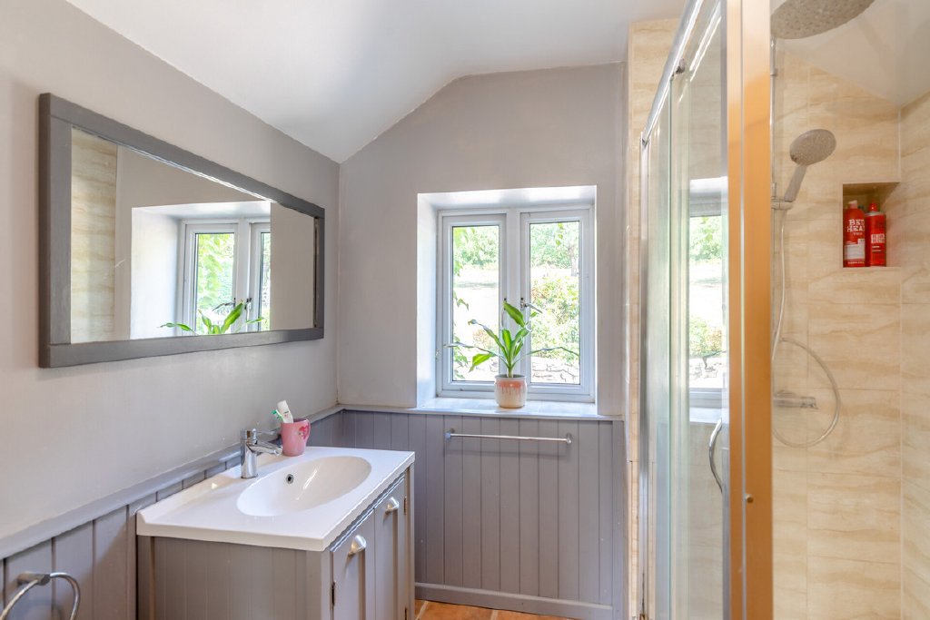 The main house has been thoughtfully designed to combine light-filled living with flexibility for modern family life. A generous sitting room with high vaulted ceilings, oak flooring and a wood-burning stove creates an impressive central space, flowing into an open-plan kitchen and dining area with direct garden access. Four bedrooms and two bathrooms are arranged with versatility in mind, including a principal suite with en suite, and a wing that can serve as a self-contained annexe if required.