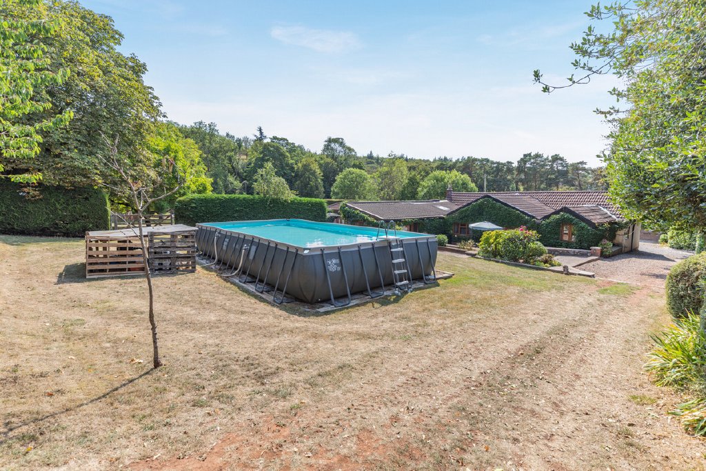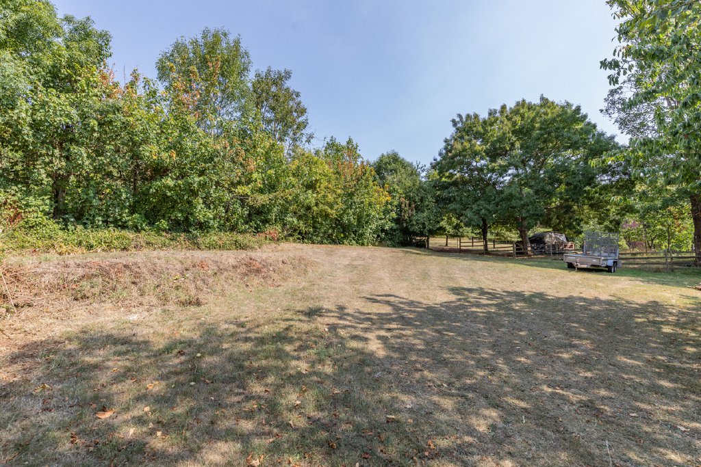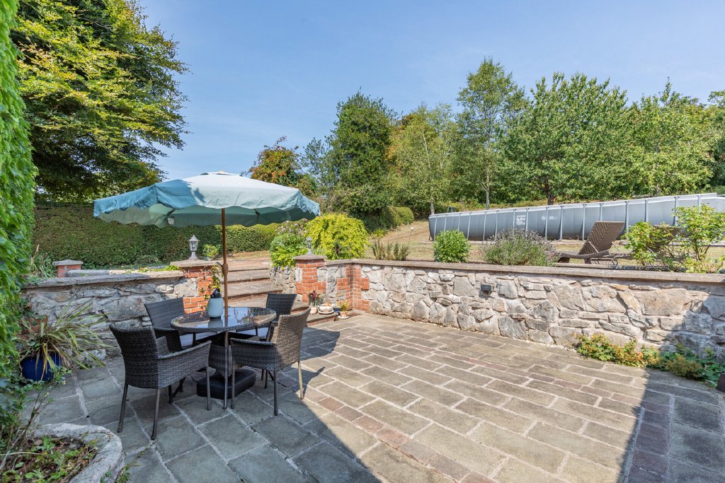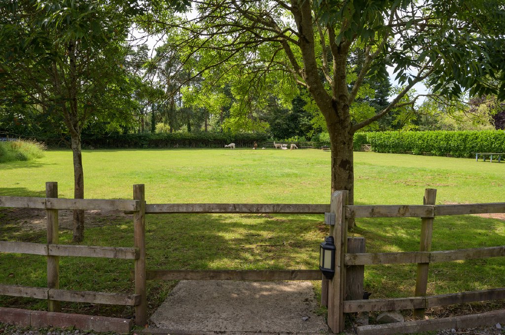 Approached by a long private driveway, the house enjoys a wonderfully secluded setting with expansive parking and an open four car barn. The grounds unfold around the property with sweeping lawns, mature trees, and an enclosed paddock – perfectly suited for equestrian or recreational use. A walled terrace adjoins the rear of the kitchen, providing a sheltered spot for outdoor dining and entertaining, with lawns extending beyond and a raised heated swimming pool.
