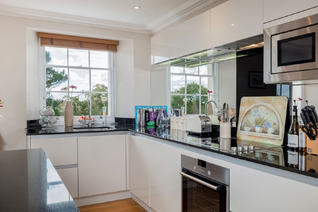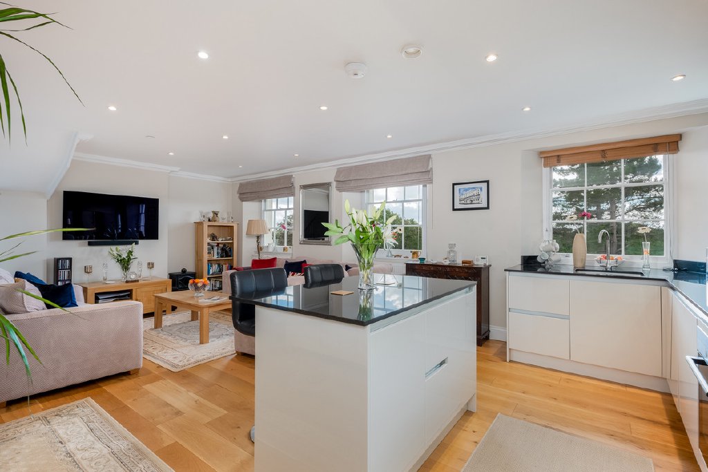 The spacious open planning living area is flooded with natural light from three large sash windows overlooking the Jephson Gardens and boasts a large living space with light wooden flooring. The high gloss handleless white kitchen with black quarts countertops features a central island with breakfast bar and integrated appliances including an induction hob, oven, dishwasher and fridge freezer.