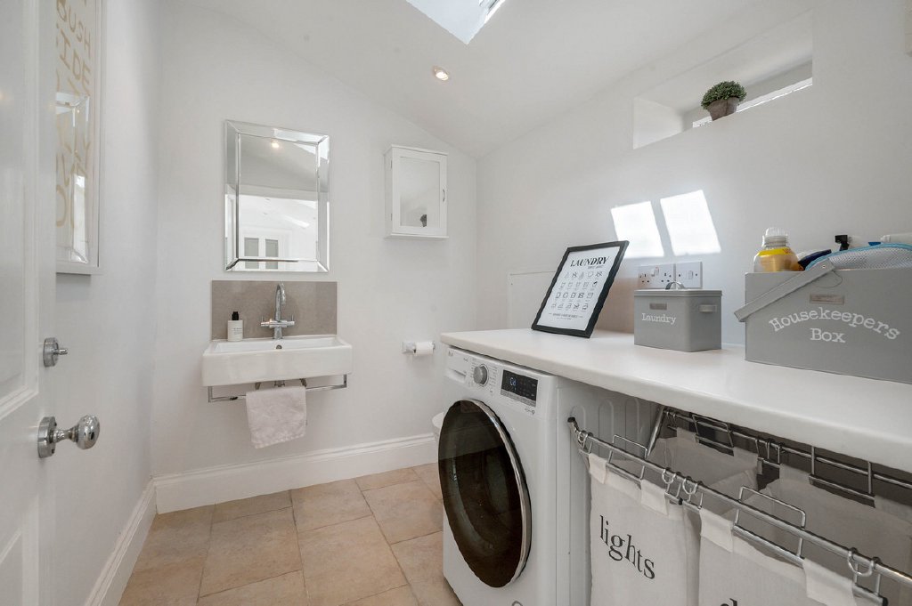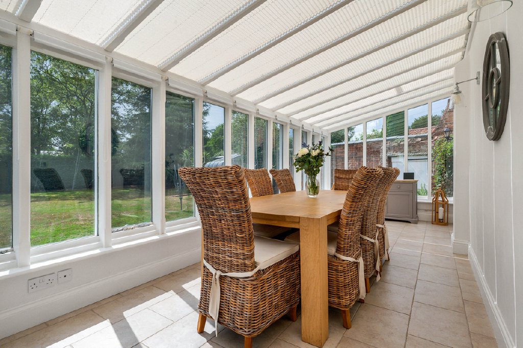 The conservatory is perfectly positioned to overlook the walled garden, with French doors opening directly onto the terrace. Bathed in natural light, it provides a delightful setting for dining, entertaining, or simply relaxing, while also offering convenient access to the laundry room with additional storage.