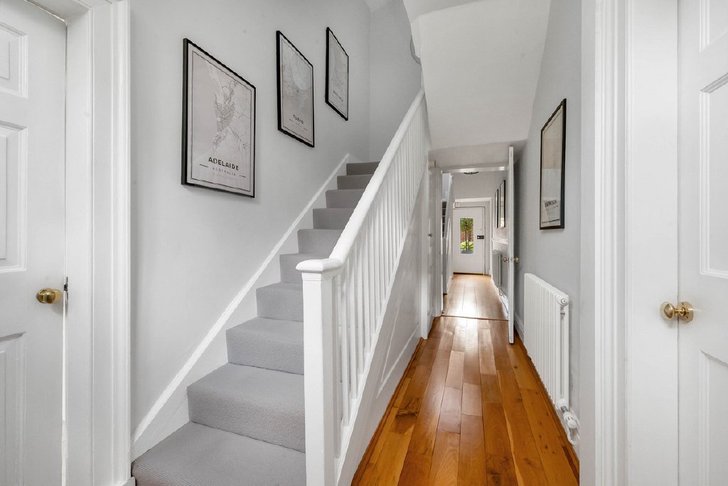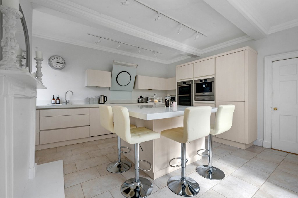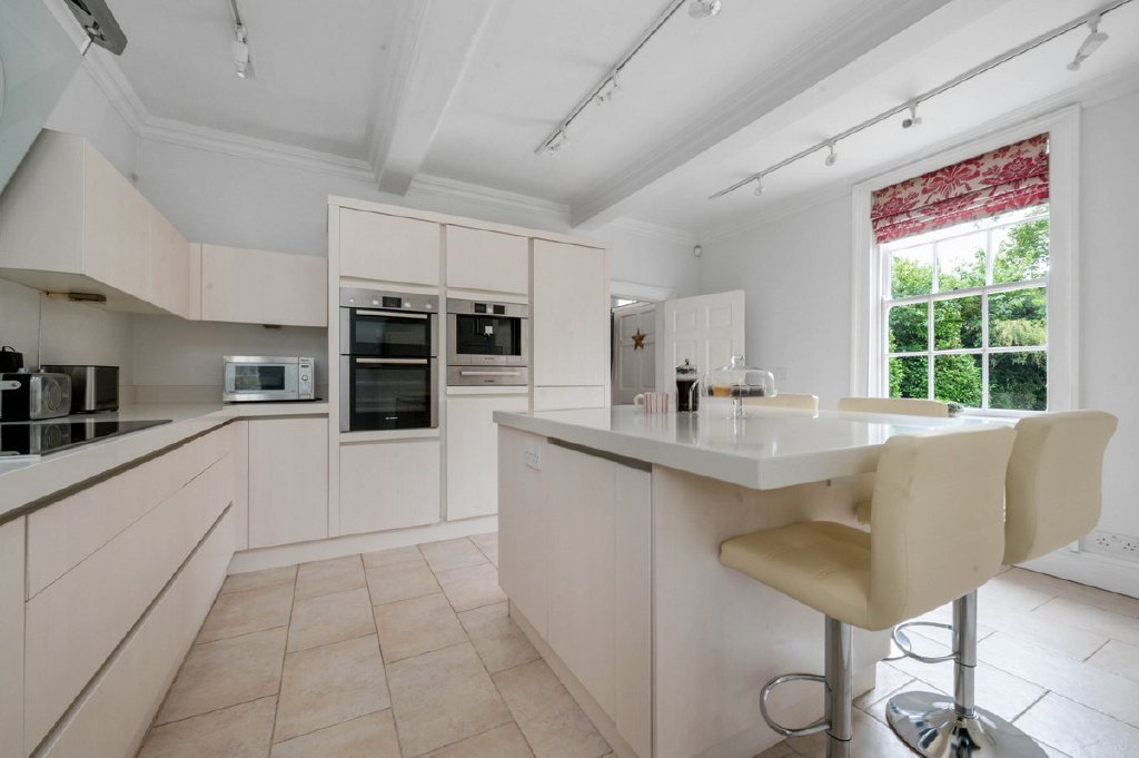 At the heart of the home lies the impressive kitchen, thoughtfully designed around a central island with breakfast bar. An extensive range of integrated appliances makes the space as practical as it is stylish, while dual-aspect windows flood the room with light and provide views over both the driveway and gardens. The kitchen connects seamlessly into a central hallway, a striking feature of the property with its two staircases—allowing easy navigation across all three floors, while offering versatile layouts that lend themselves perfectly to multigenerational living.