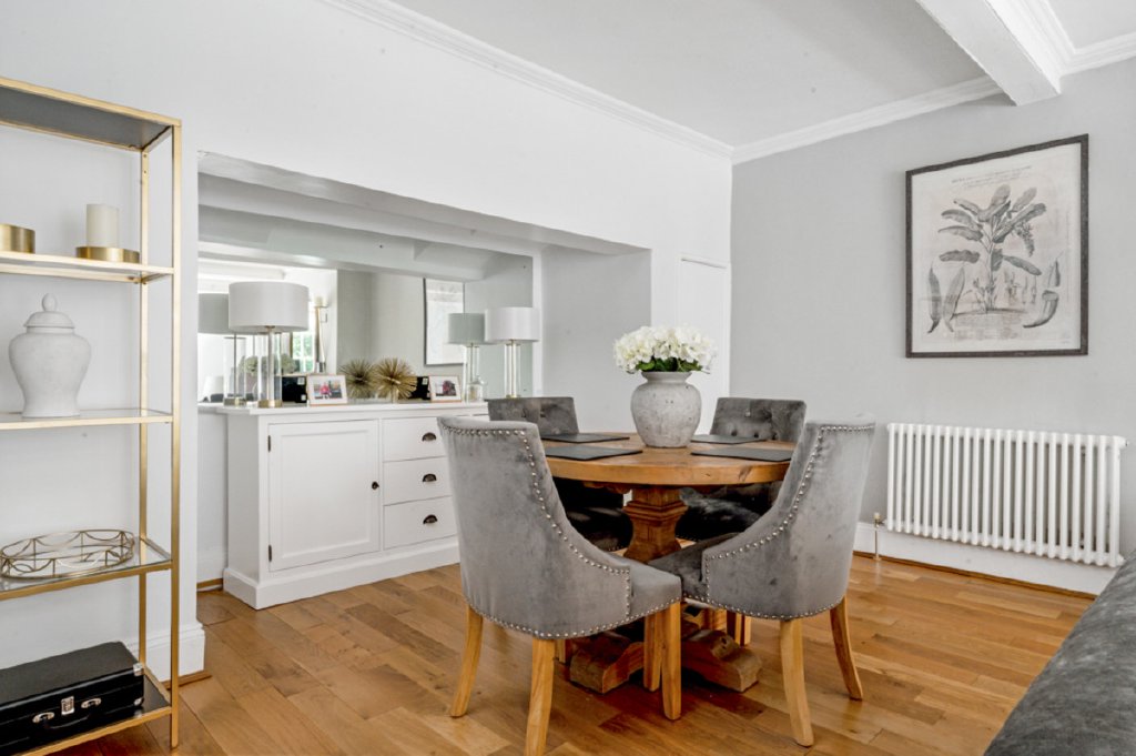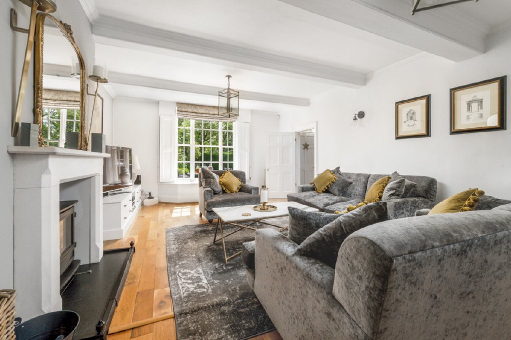 The hallway also gives access to a useful half cellar, a large guest cloakroom/boot room, and doors leading directly to both the garden and driveway. From here, you are drawn into two elegant reception rooms: a beautifully proportioned sitting room, centred around a feature fireplace with wood-burning stove and complemented by a charming window seat overlooking the garden, and a more intimate snug.