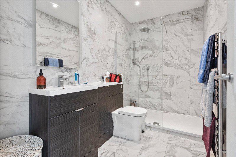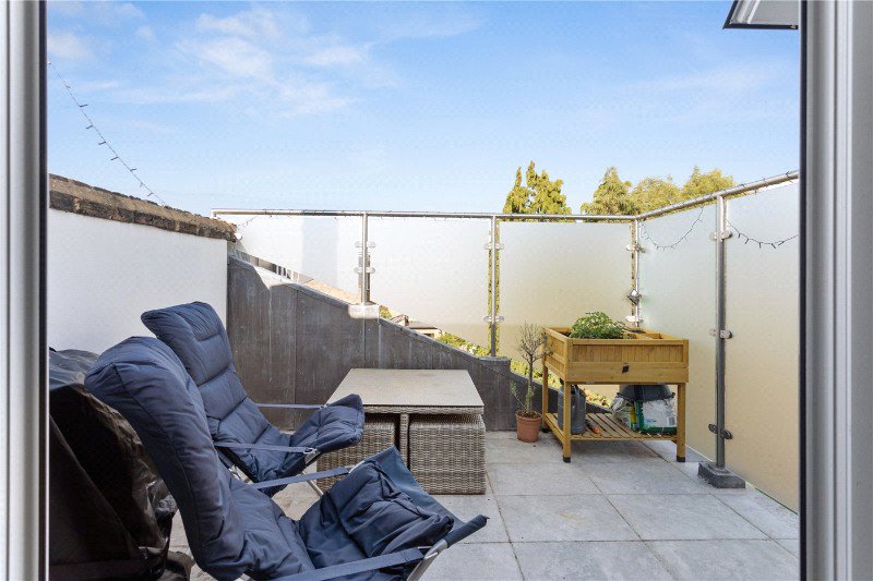 On the upper floor of this three-double-bedroom maisonette, you’ll find a spacious reception room featuring fitted carpet, recessed lighting, and direct access to a private patio terrace—an ideal spot for relaxing or entertaining guests. The stylish kitchen and dining area is finished with engineered wood flooring and boasts a sleek range of wall and base units with integrated appliances, white countertops, and a central island offering generous storage. Skylight windows, recessed lighting, and modern fixtures and fittings complete this contemporary space.