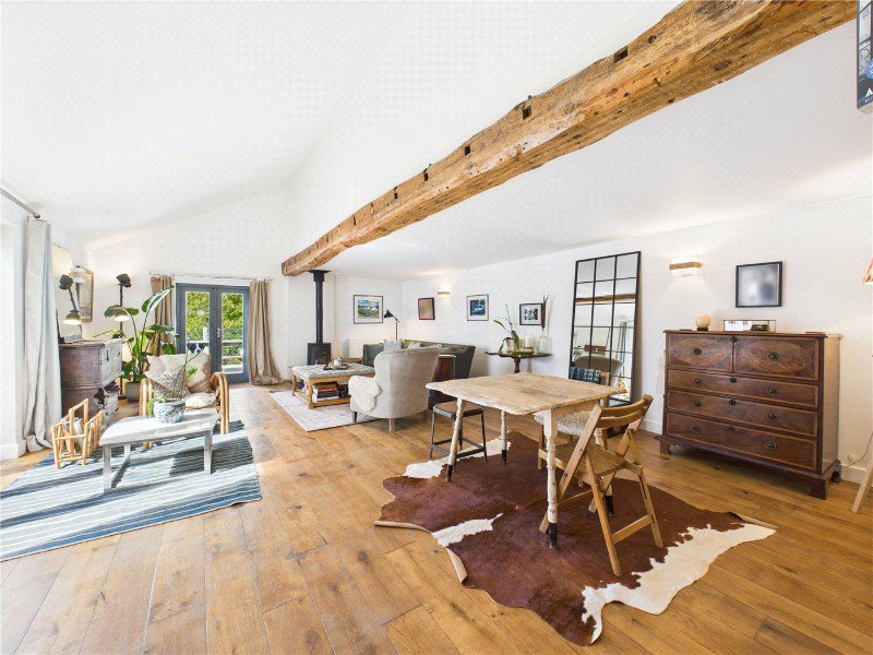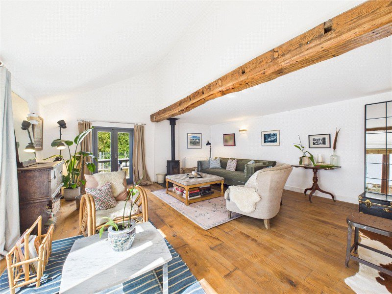 The main living room is a truly impressive space, bathed in natural light and full of character. Vaulted ceilings and a stunning exposed wooden beam give the room a sense of grandeur, while the freestanding log burner provides a cosy focal point for winter evenings. French doors open directly onto the garden, creating a harmonious indoor outdoor flow and making this room ideal for both everyday living and entertaining.