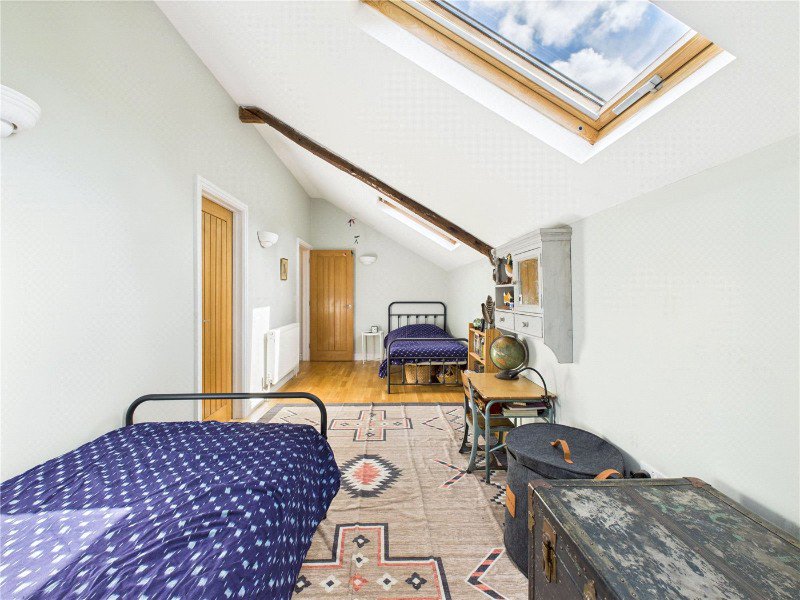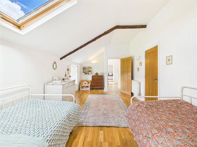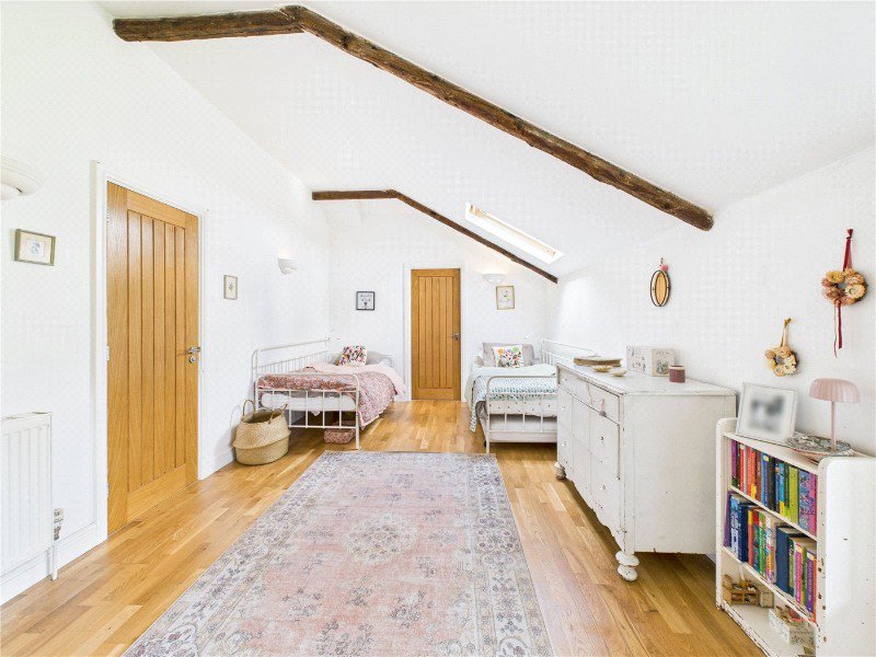 The two remaining double bedrooms are equally generous in size and cleverly connected by an internal doorway, making them ideal for children, siblings, or guests. Both bedrooms enjoy vaulted ceilings with exposed beams, Velux windows for natural light, and charming, individual styling. Importantly, each also includes its own walk in wardrobe, providing excellent storage and helping keep the rooms uncluttered and versatile.