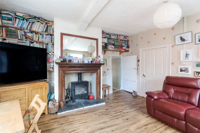 From the hall, 2 steps lead up to the nicely proportioned, bright and airy, dual aspect living room which features a fireplace with a wood burning stove, a window onto East Street, and a Listed arched window overlooking the millstream to the side.