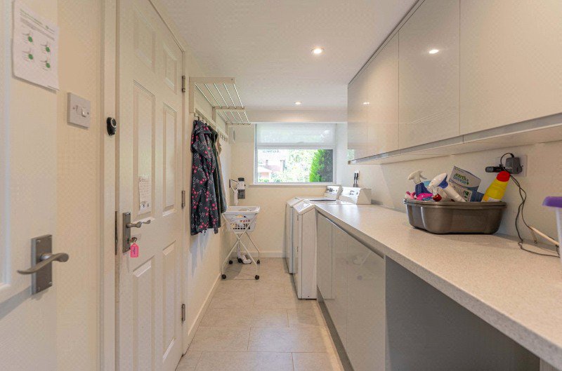 The adjacent utility room provides further storage and workspace, with internal access to the garage. The entire open-plan area enjoys wooden floorboards, which extend throughout the rest of the property, and offers wonderful views across the rear garden.