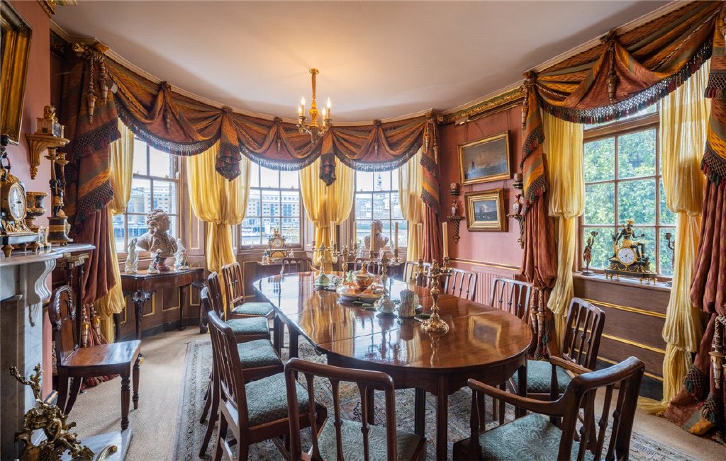 The river Thames surrounds the house on two sides and this aspect is uniquely exploited in the first floor drawing room and raised ground floor dining room below it. Both have a full width apsidal window facing the river and side windows which frame Tower Bridge and The Shard beyond. These rooms give the impression of being in the captain’s quarters of an 18th century English 1st rate ship of the line; a truly unique experience. The barrel windows are the architect Philip Hardwick’s master stroke as he has combined them with an extended eave overhang from the elegant shallow pitched roofline giving the exterior a very striking main feature.
