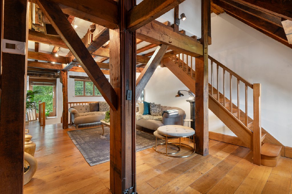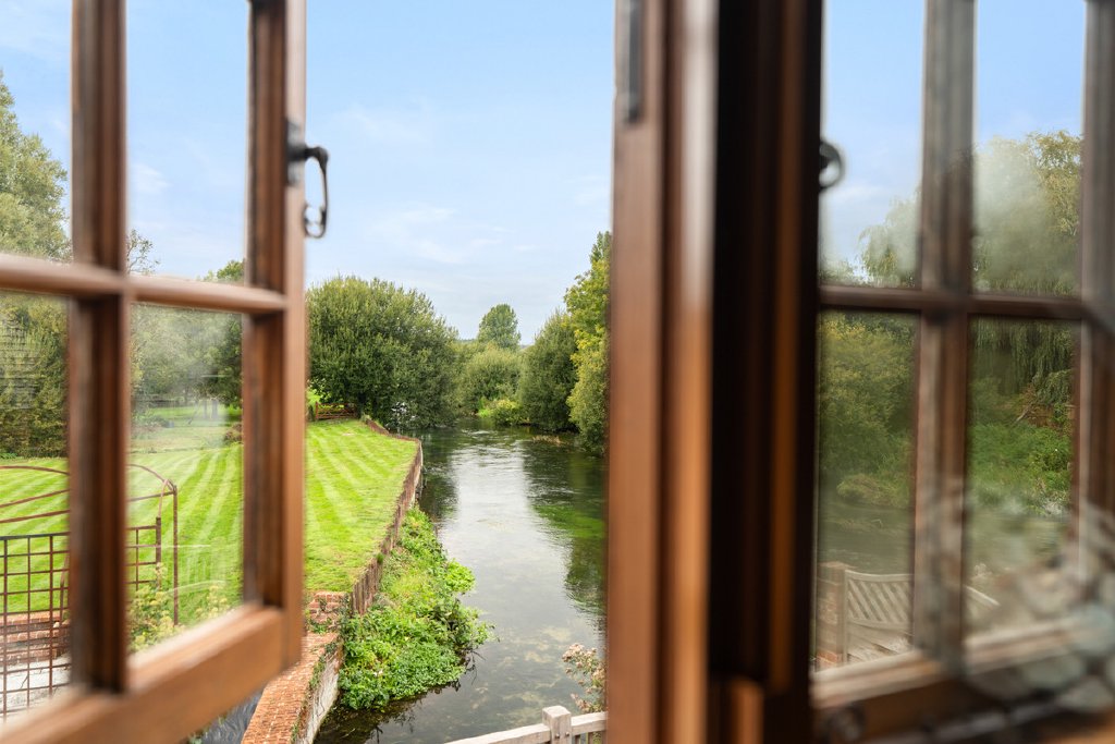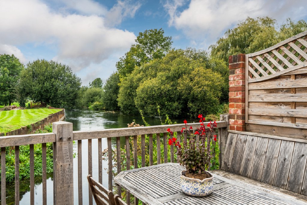 The ground floor is centred around a spacious open-plan dining/breakfast room that flows seamlessly into a well-appointed kitchen. A striking glass floor provides a unique view of the River Test below, creating a truly memorable focal point. From here, doors open onto a private decked terrace overlooking the water which is an idyllic setting for morning coffee or al fresco entertaining. A cloakroom completes this level.