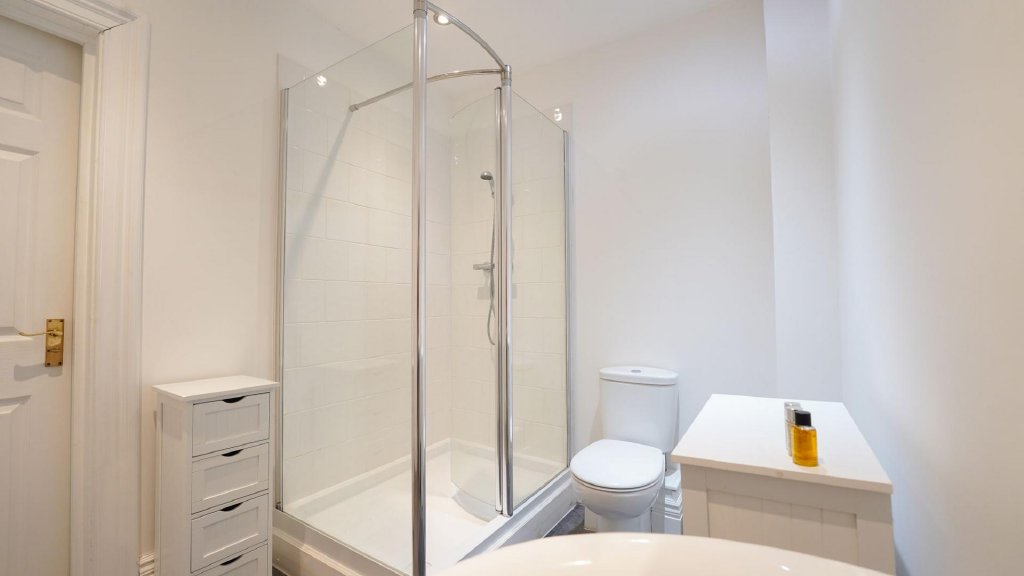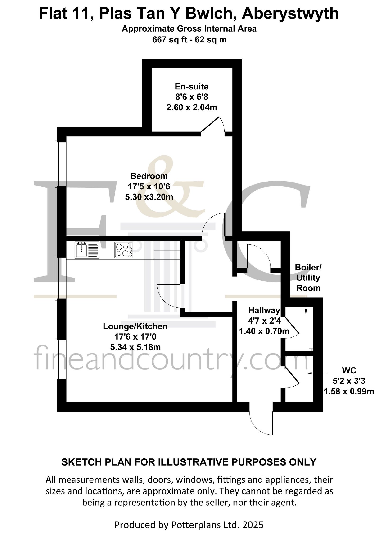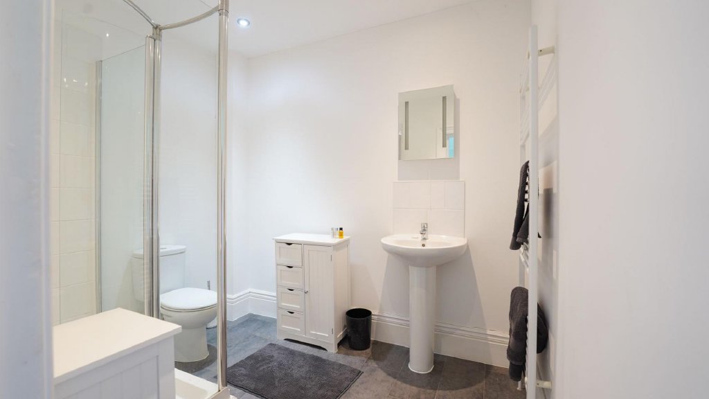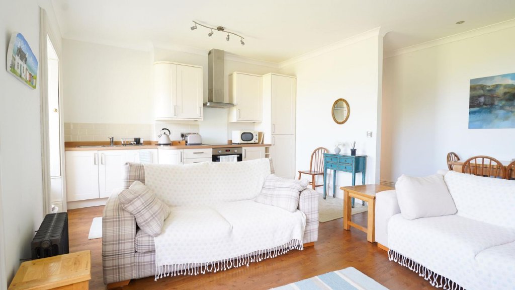 The apartment is thoughtfully arranged, with a bright open-plan lounge, kitchen and dining space enjoying plenty of natural light. The generous double bedroom is complemented by a stylish en-suite shower room, and there is also a separate guest WC and a practical utility/boiler room.