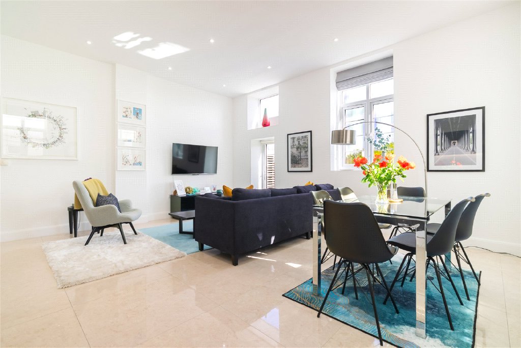 Full-height doors open from the reception space onto a substantial private garden terrace, ideal for al fresco dining and entertaining. The property also benefits from an allocated parking space.