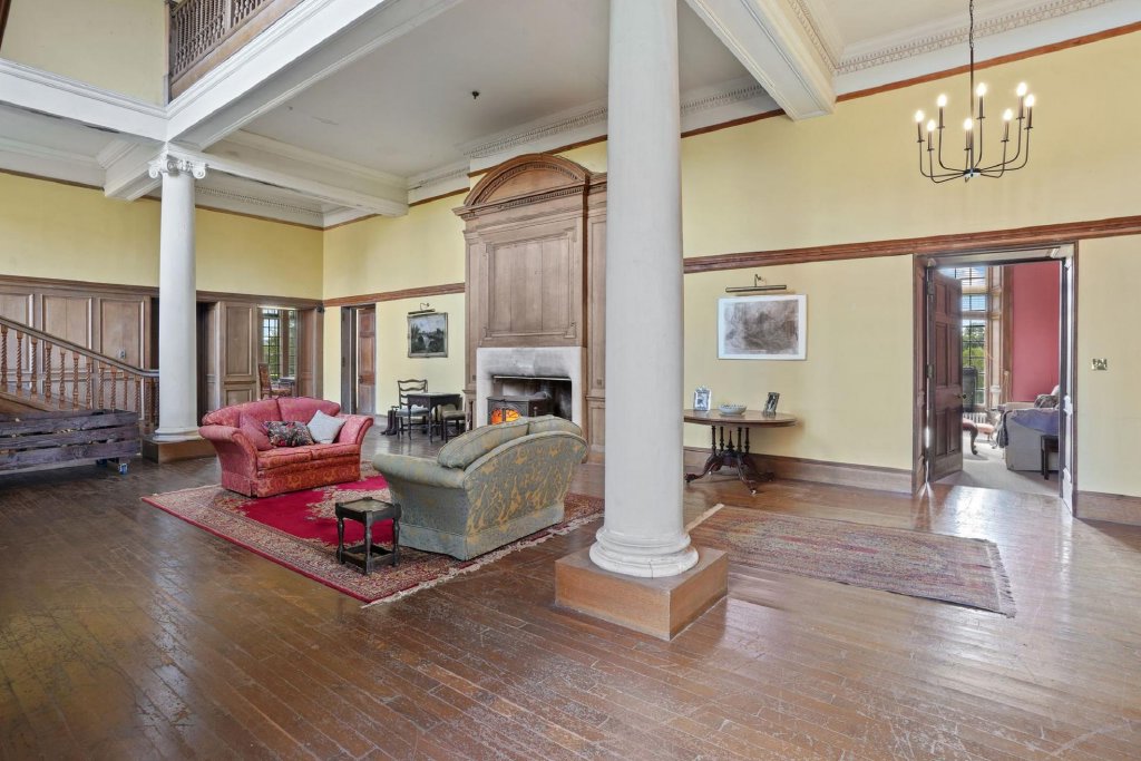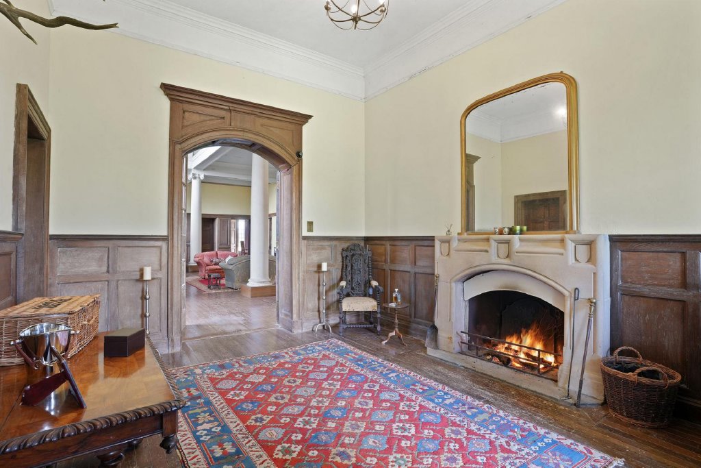 The grand double-height reception hall, complete with a sweeping staircase and impressive stone fireplace, creates an immediate sense of occasion upon arrival.