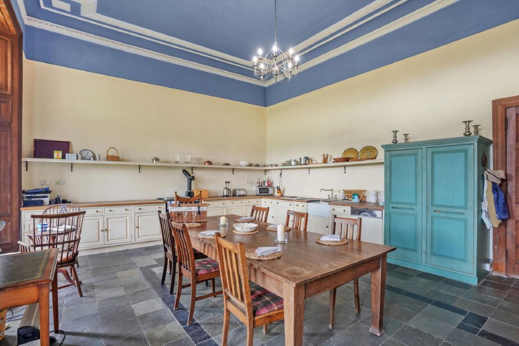 The kitchen appointed with classic cabinetry and a Raeburn oil-fired cooker has an expansive south-facing outlook over the loch. Additional flexible spaces on this level include a panelled anteroom with fireplace, a traditional office, and a dining room with a grand open fireplace and captivating south and east views.