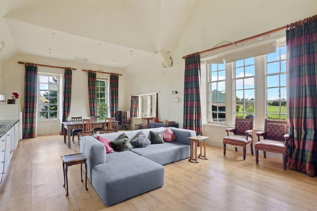 The east wing flat is perfect for guest accommodation or multi-generational living, comprising a light-filled kitchen and living space, three spacious bedrooms, a shower room, and a private corridor with spiral staircase.