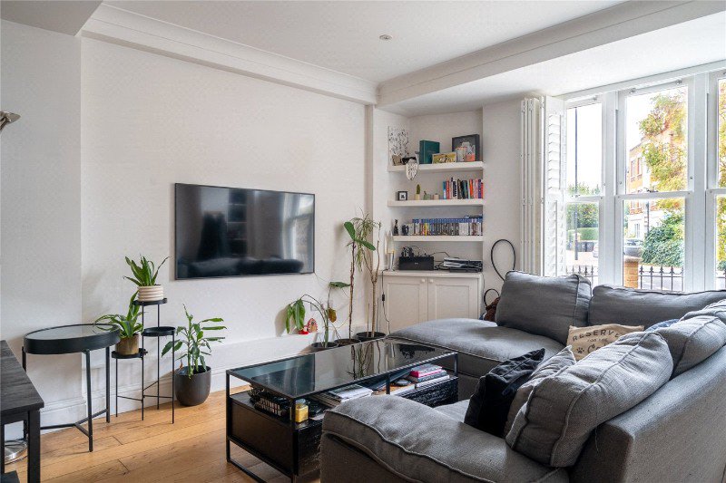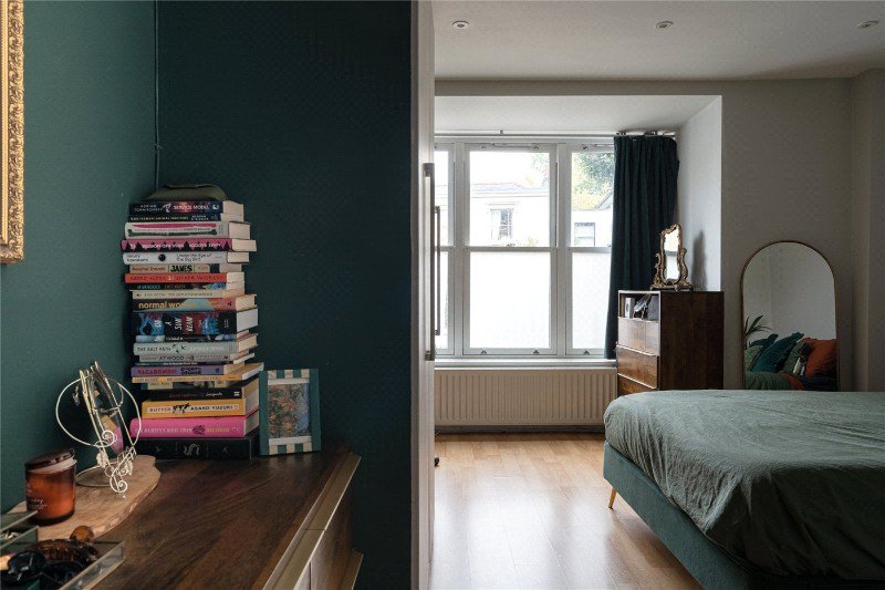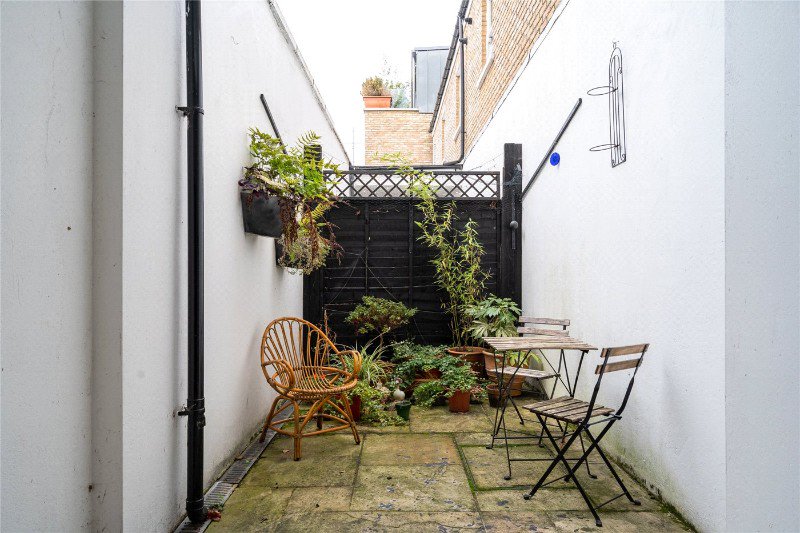 Set within an end-of-terrace period building on ever-popular Brixton Water Lane, this generous two-bedroom, two-bathroom maisonette combines scale, storage and a private garden. A wide reception room spans the front with twin windows, decorative coving and bespoke shelving and cupboards to the alcoves; there’s ample space for a large dining table. The adjoining kitchen is neatly planned with modern cabinetry and integrated appliances (oven, hob, fridge-freezer and dishwasher), plus space for a washing machine. A useful store room off the reception houses the boiler with space for a tumble dryer.