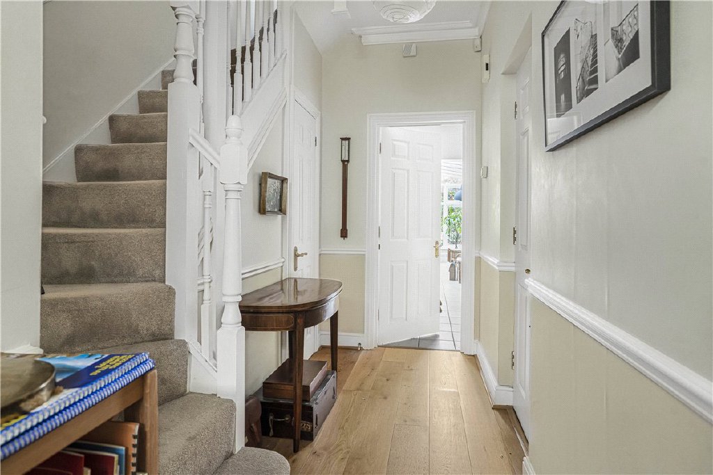 Tucked away in the corner of Merrivale Square, this attractive Georgian-style townhouse enjoys a prime position overlooking the well-maintained communal gardens and seating, which residents are free to enjoy. Arranged across three floors, the home offers well-balanced accommodation with a wonderful sense of light and space, accentuated by high ceilings throughout.