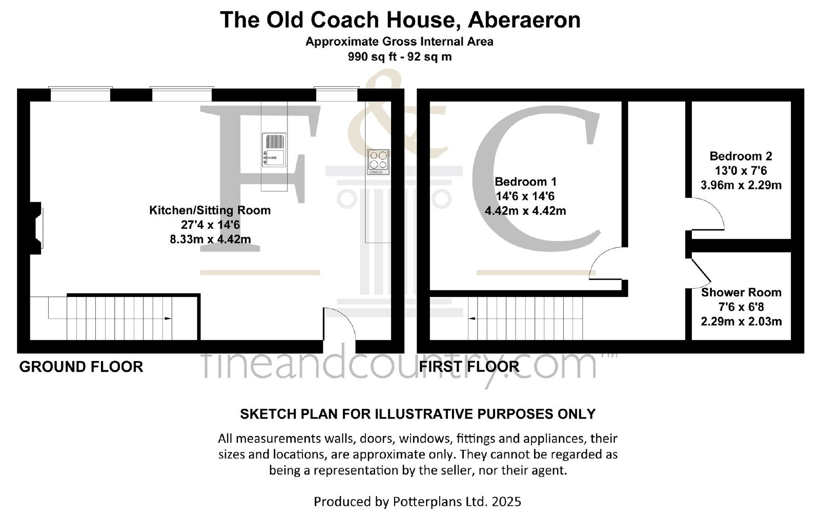 The sitting area offers a welcoming feel with a wood-burning stove, creating a cosy focal point. An open-plan staircase leads to the first floor.