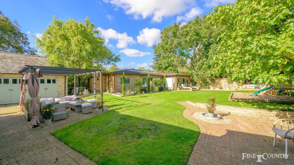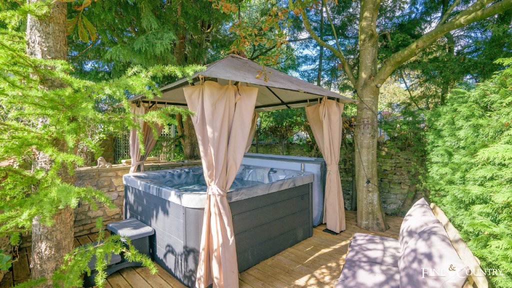 The garden is set up to be used rather than merely admired. In late spring the wisteria puts on a show across the front elevation and along the garage, softening the stone and giving the approach a seasonal lift. The plot is enclosed and largely private, with a sense of calm that belies the central village position. A pergola gives a sheltered place to eat outside; a neat bar area does duty for parties; a children’s zone keeps younger visitors happy; and a decked walkway leads to a raised terrace currently arranged for a hot tub (hot tub is available by separate negotiation). Planting softens the boundaries and draws you along the routes between house, terrace and outbuilding. Practicalities are unusually strong for a listed home. There is space for two cars at the front, more secure parking behind gates at the side and straightforward on-street parking on Berrybushes. The double garage is a proper workspace with a sink and tap and room for tools or hobby projects. An EV charger sits just inside the gates ready for the next environmentally conscious owner.