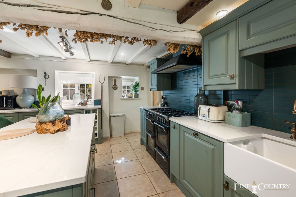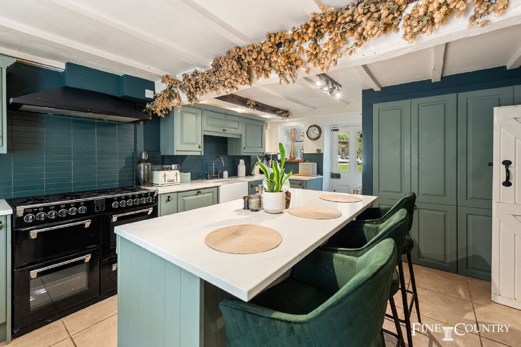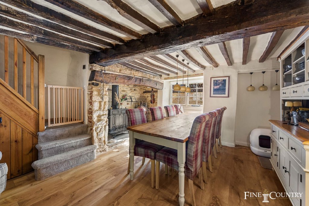 Across the hall is the kitchen, which was completely refitted in 2024 and sits at the centre of the ground floor. A range cooker takes care of serious cooking, an island with stool seating doubles as a breakfast spot and perch for friends, and storage has been planned sensibly. The palette is calm and contemporary but does not fight the older parts of the house. Adjacent to the kitchen is the dining room. A broad inglenook with a wood burner anchors the space, and there is space for a long table without feeling crowded. It is easy to picture Sunday lunches that drift into the afternoon.