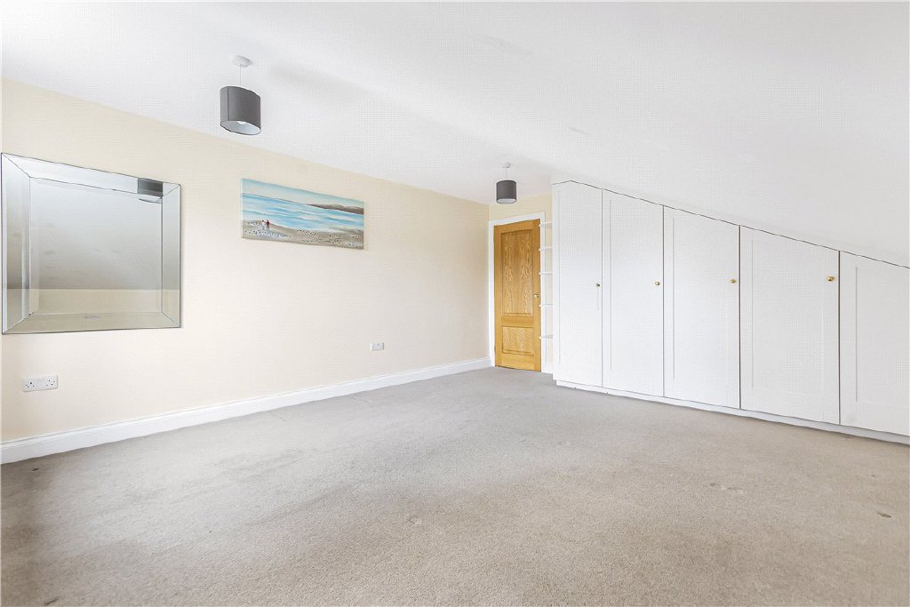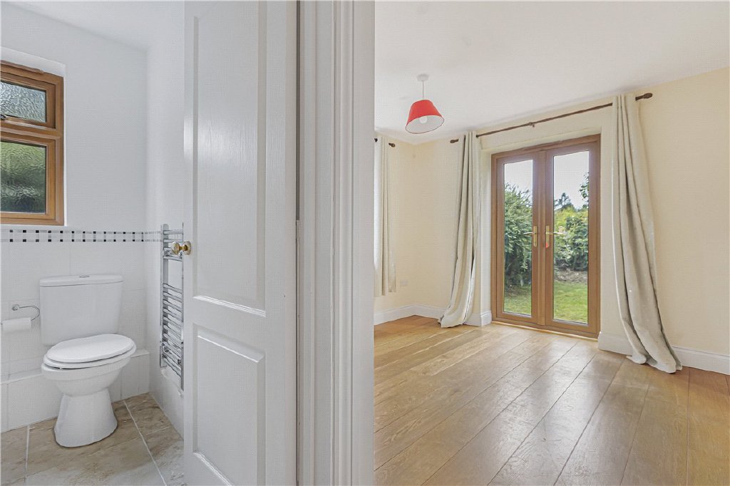 The first floor has a large galleried landing overlooking the reception hall. The principal bedroom is a large double room with French doors and Juliet balcony, overlooking the house gardens and countryside beyond. The room has built-in eaves wardrobes, and an ensuite comprising walk-in shower, wash basin on vanity unit, toilet, and chrome heated towel rail. Bedroom two is a double room with built-in wardrobes and ensuite shower room. There are two further double bedrooms, and house bathroom comprising bath with separate shower enclosure. Some of the rooms have sloping ceilings.