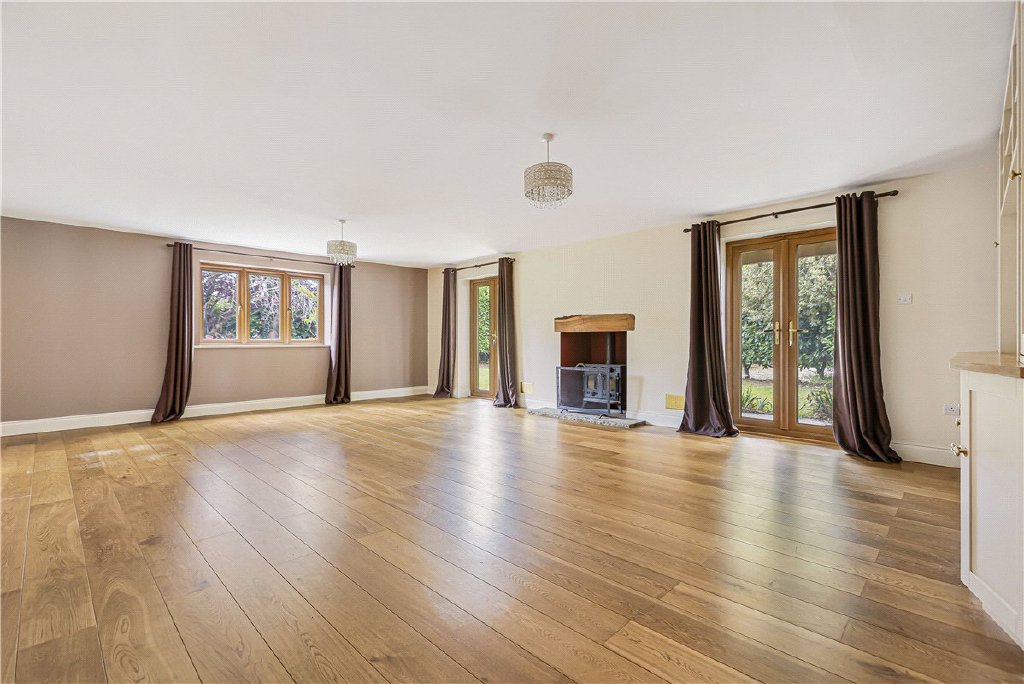 The sitting room is a large well balanced room with a central fireplace encasing a woodburning fire, There is also a bespoke media cabinet and two sets of French doors opening onto the gardens.