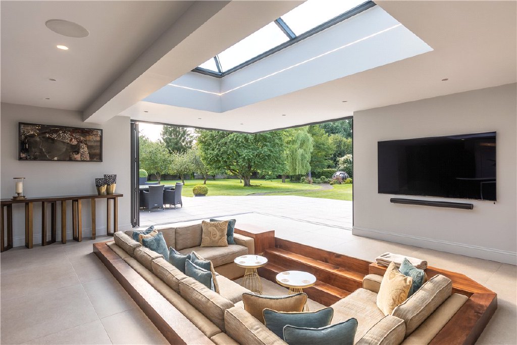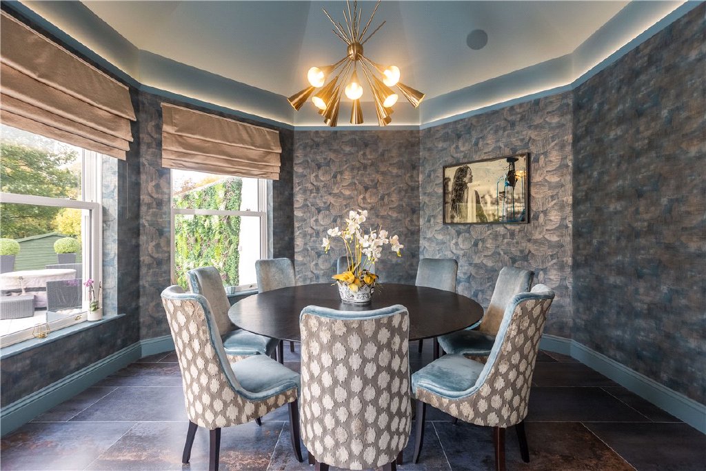A tree-lined, gated drive leads to an impressive reception hall with vaulted ceiling and a solid oak split staircase. Reception space is outstanding: a formal lounge with stone fireplace; a magnificent family room with five arched Tudor-style French doors to the terrace; and an expansive, open-plan living kitchen by The Handmade Kitchen Company, finished with quartz worktops, BORA downdraft hob and premium AEG appliances. A bespoke bar adjoins for effortless entertaining, while the octagonal dining room and a classical snooker room add further versatility. Practical spaces include a boot room, a stylish ground-floor bathroom and a fitted utility.