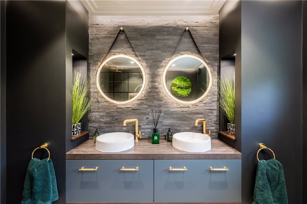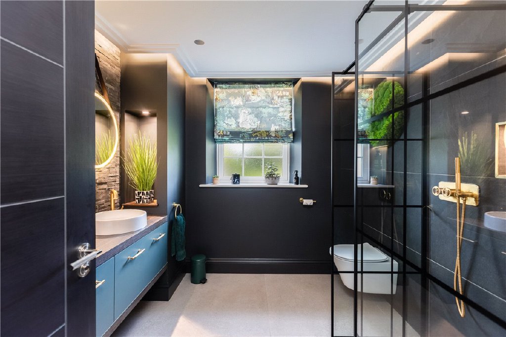 Upstairs, the galleried landing serves five double bedrooms. The principal suite enjoys a Juliette balcony, dressing room and a luxury en-suite with freestanding bath and walk-in shower; two further well-appointed family bath/shower rooms complete the floor.