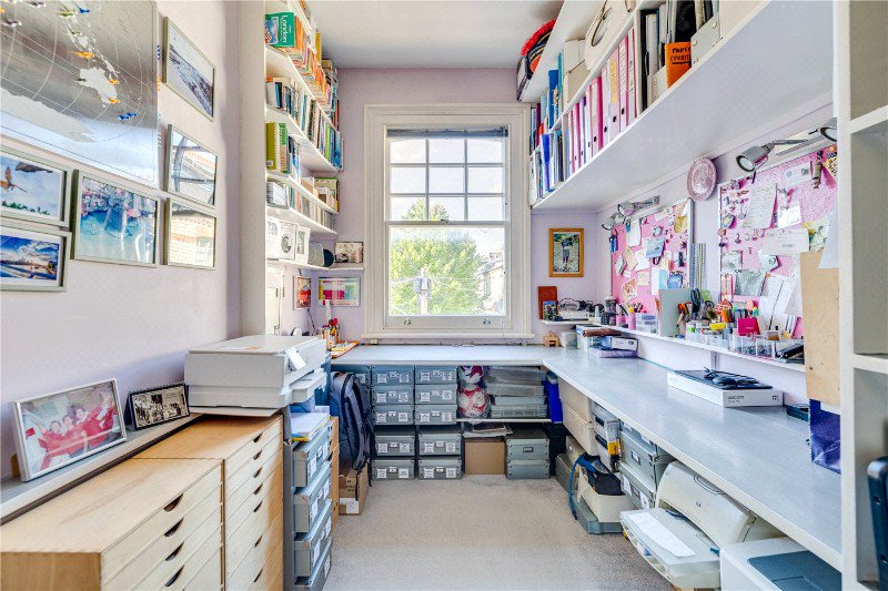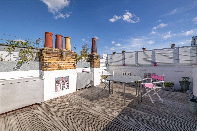 The property boasts its own private ground floor entrance, opening onto a generously proportioned first floor. On the first floor are three good-sized bedroom. The smallest of the bedrooms has flexible use as a study but would also make an excellent third bedroom. The remaining two bedrooms are of equal size with one having built in wardrobes. Towards the rear there is a family style bathroom fitted with a separate bath and a shower. Adjacent to the bathroom is two large built in storage cupboards. At the rear of the first floor is the bright and open-planned modern kitchen. The second floor consists of a spacious, light and bright reception room with direct access to an exceptional private roof terrace which is perfect for entertaining and alfresco dining.