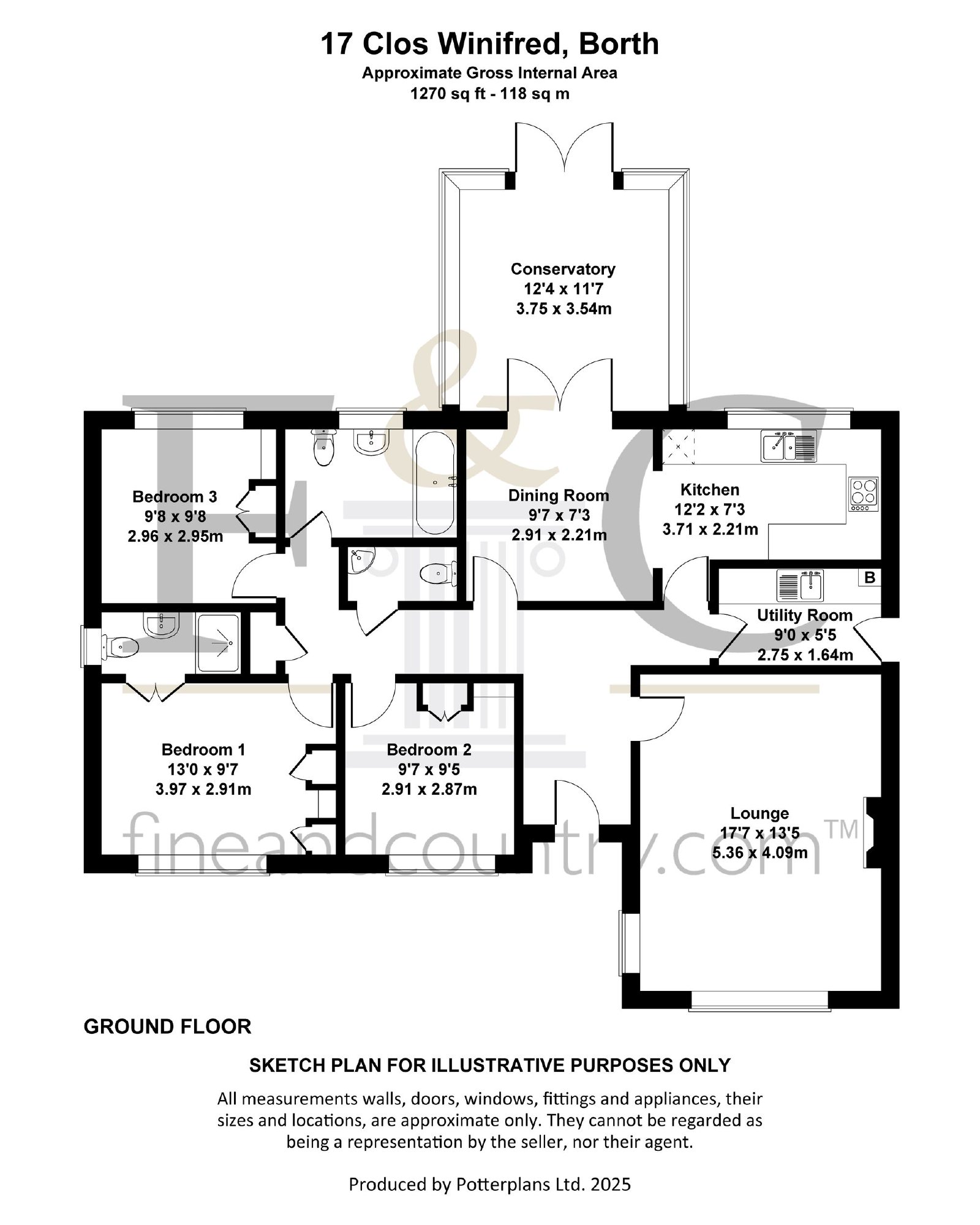 The accommodation includes a sitting room with feature fireplace, kitchen/dining room, utility, conservatory, cloakroom, three bedrooms (one en suite), and a family bathroom.