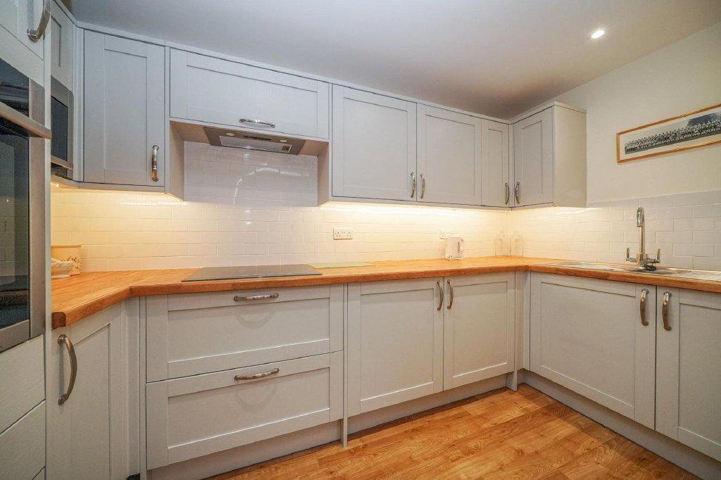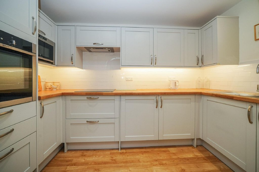 This property is offered for sale with no onward chain and provides spacious, well-presented accommodation. The open-plan living area features a modern remote-controlled flame-effect electric fire, creating a cosy and contemporary feel, and a delightful outlook over the communal gardens. The modern fitted kitchen is equipped with an electric hob, eye-level oven, integrated microwave, and under-counter fridge and freezer, and a water softener. A utility/storage room houses a washing machine and tumble dryer for added convenience.