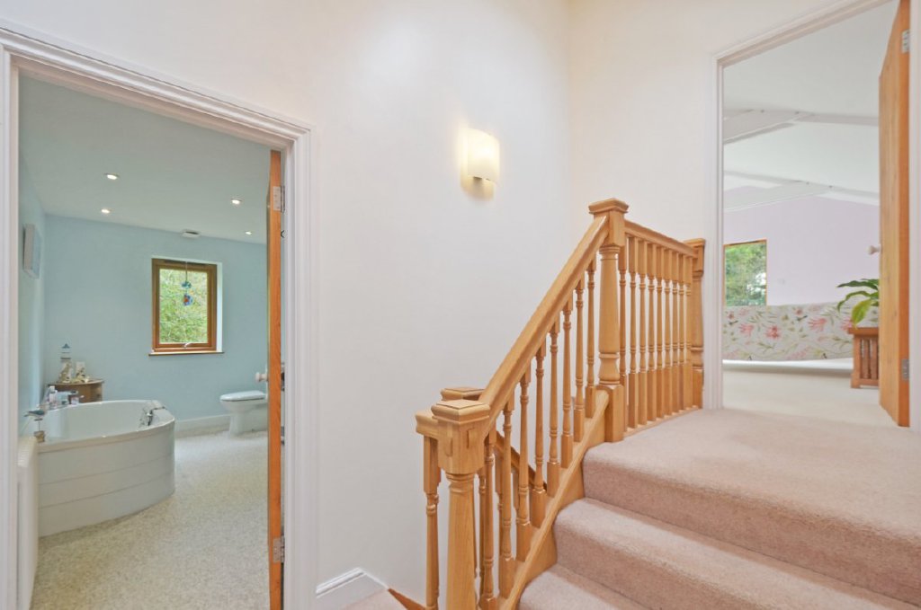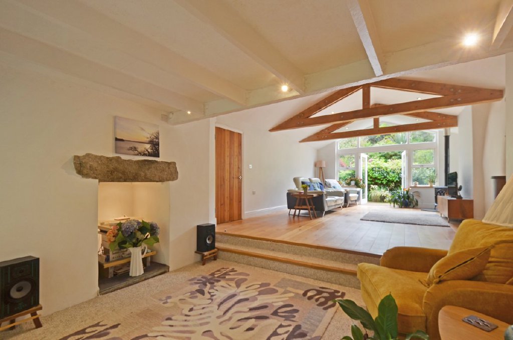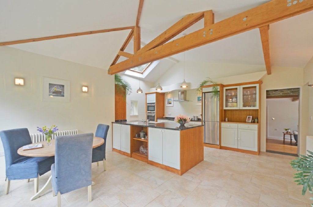 The spacious, light-filled home was originally a traditional barn and has been thoughtfully and extensively extended to create a substantial five-bedroom residence that blends rustic charm with modern living. The property retains characterful features such as granite finishes and a woodburning stove, while offering generous, open-plan living spaces with high ceilings totalling circa 2,500 sq ft. Views from the property via the large french doors, as well from the balcony in the principle bedroom suite overlook the gardens and land within the property.