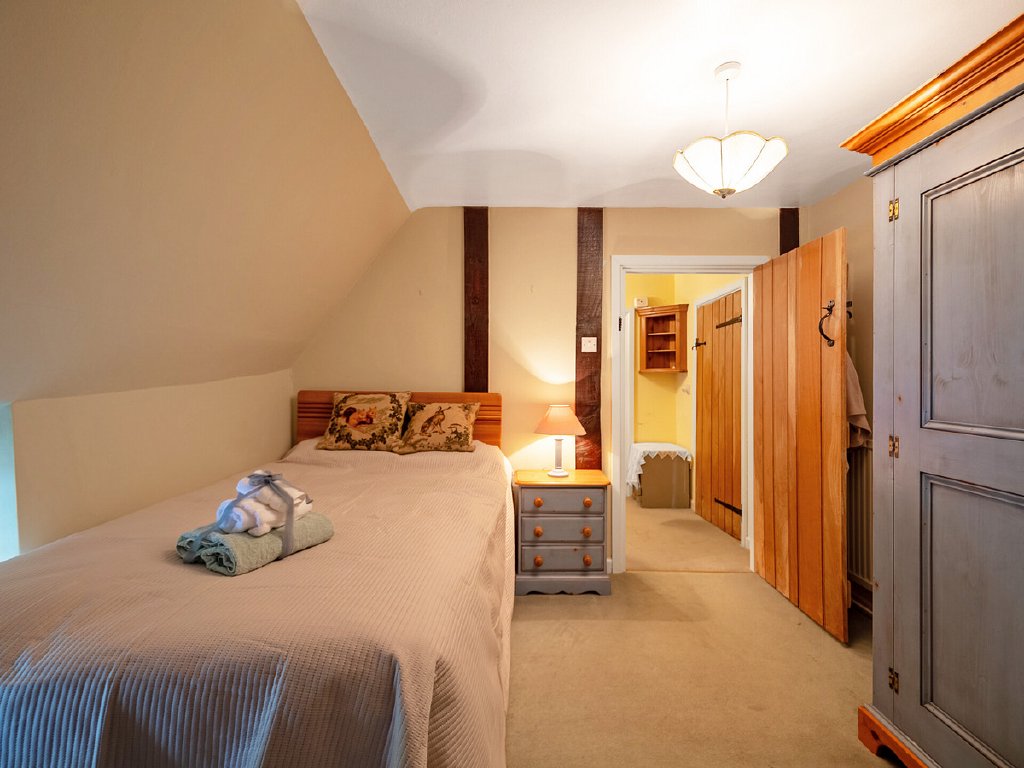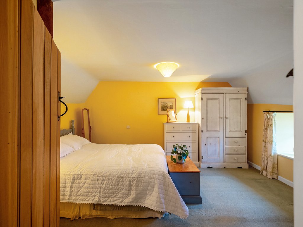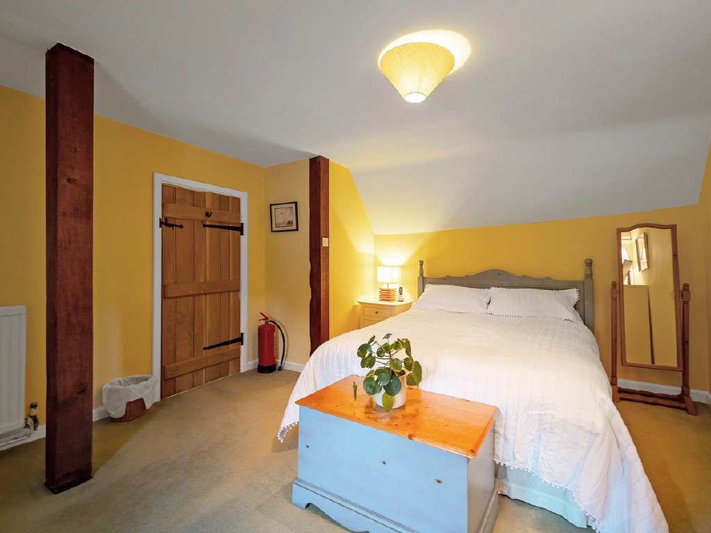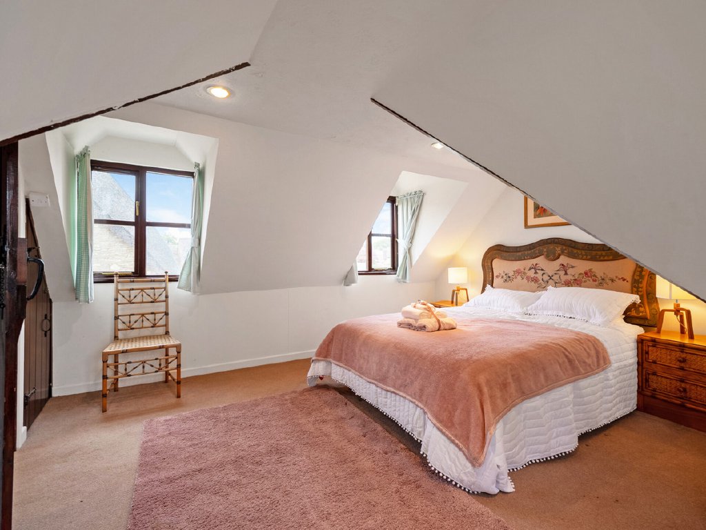 Upstairs in the main part of the cottage are two comfortable double bedrooms, both framed by exposed timbers and distinctive eyebrow windows that sit beneath the gentle curve of the thatch. The smart family bathroom, that offers shower over bath, combines traditional finishes with modern fittings that suit the cottage’s character.