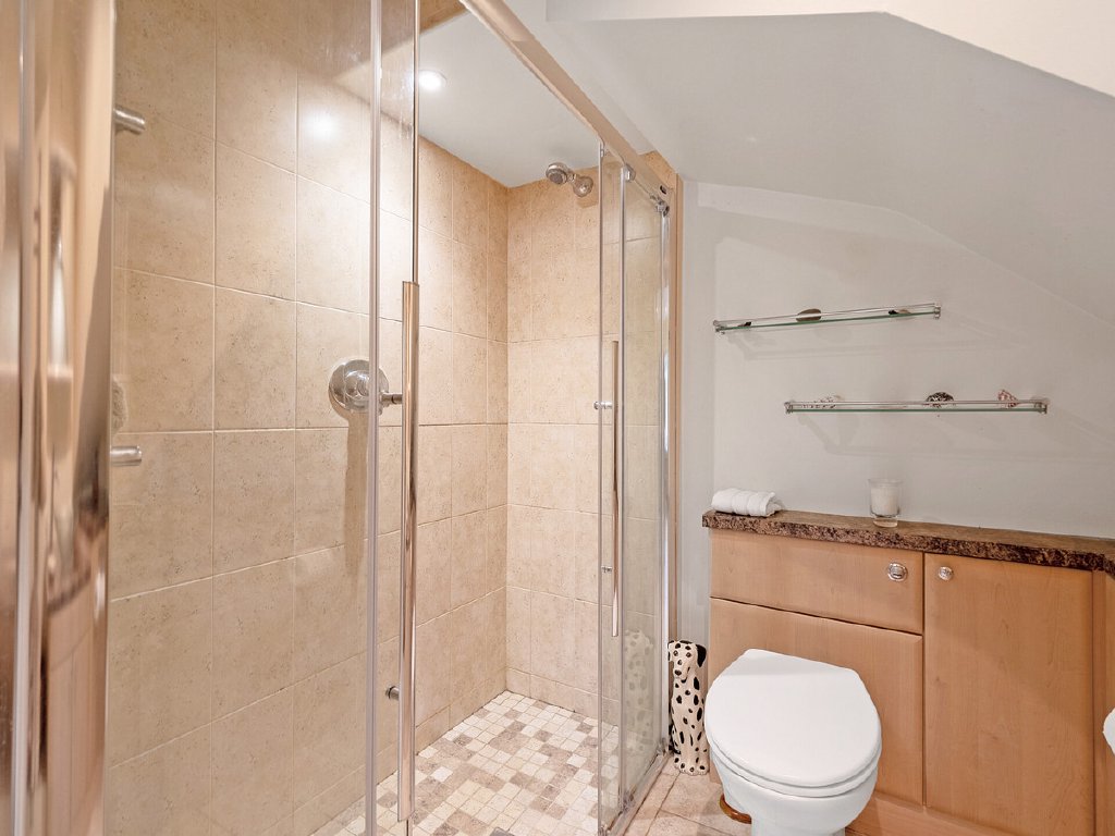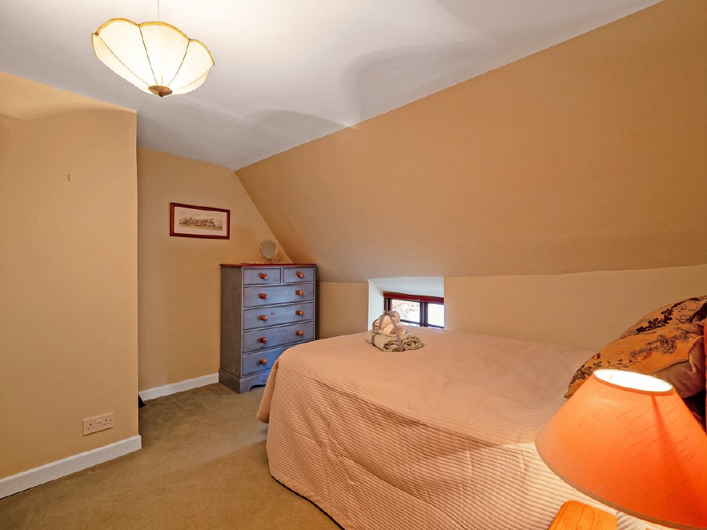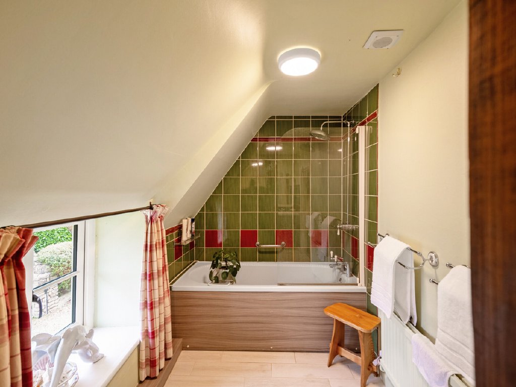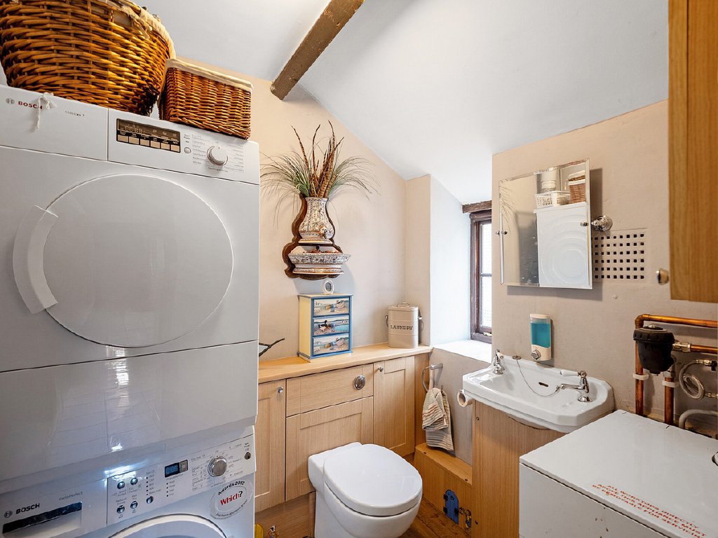 Upstairs in the main part of the cottage are two comfortable double bedrooms, both framed by exposed timbers and distinctive eyebrow windows that sit beneath the gentle curve of the thatch. The smart family bathroom, that offers shower over bath, combines traditional finishes with modern fittings that suit the cottage’s character.