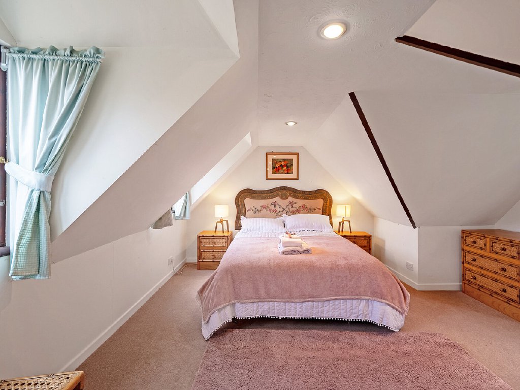 In the newer part of the property, a rear staircase rises to an additional double bedroom above the garage, offering a flexible self-contained suite for guests, teenagers, or use as a creative workspace.